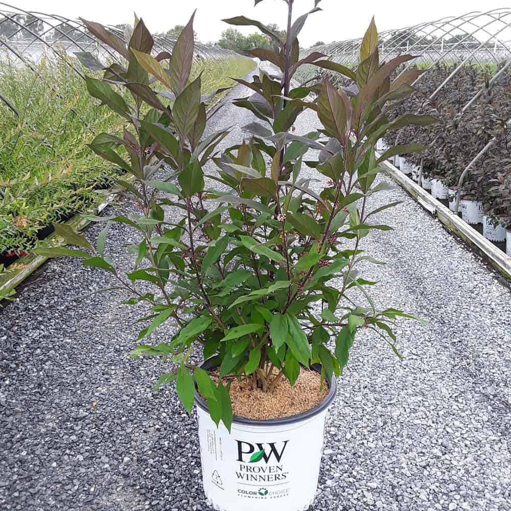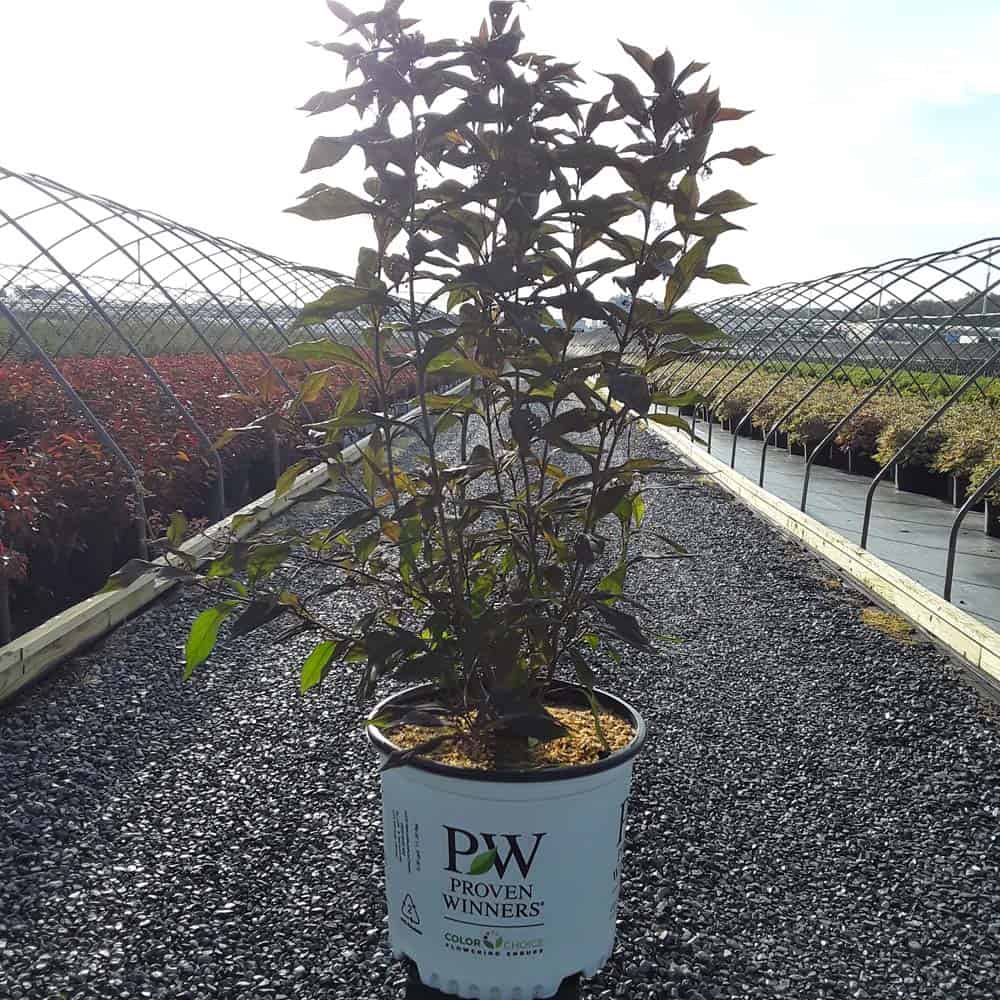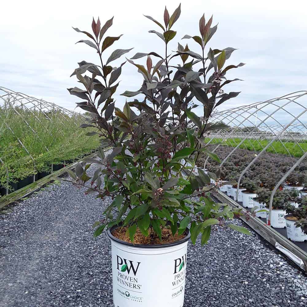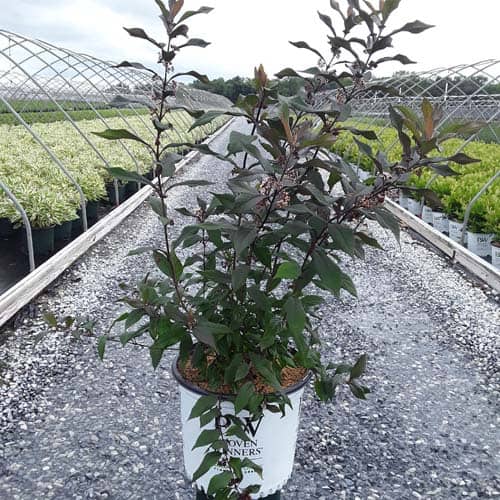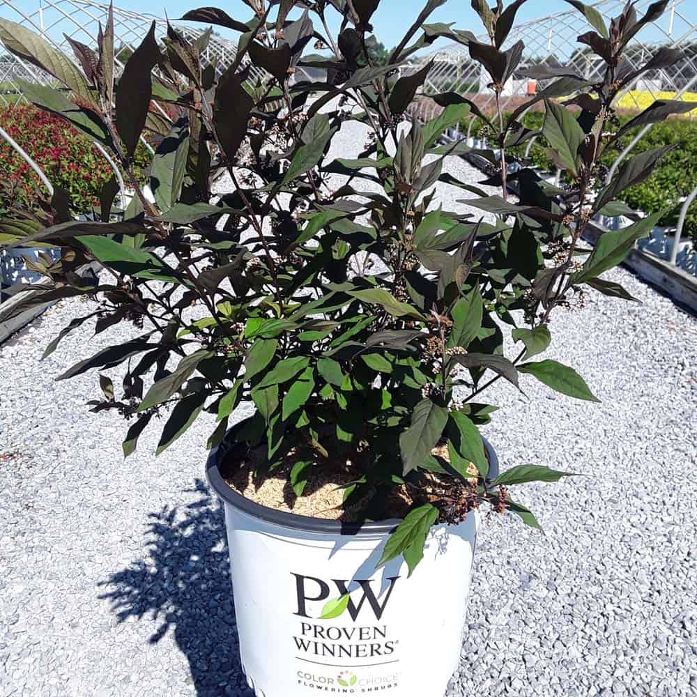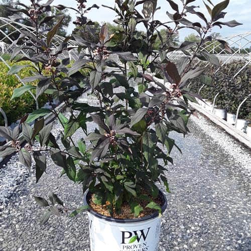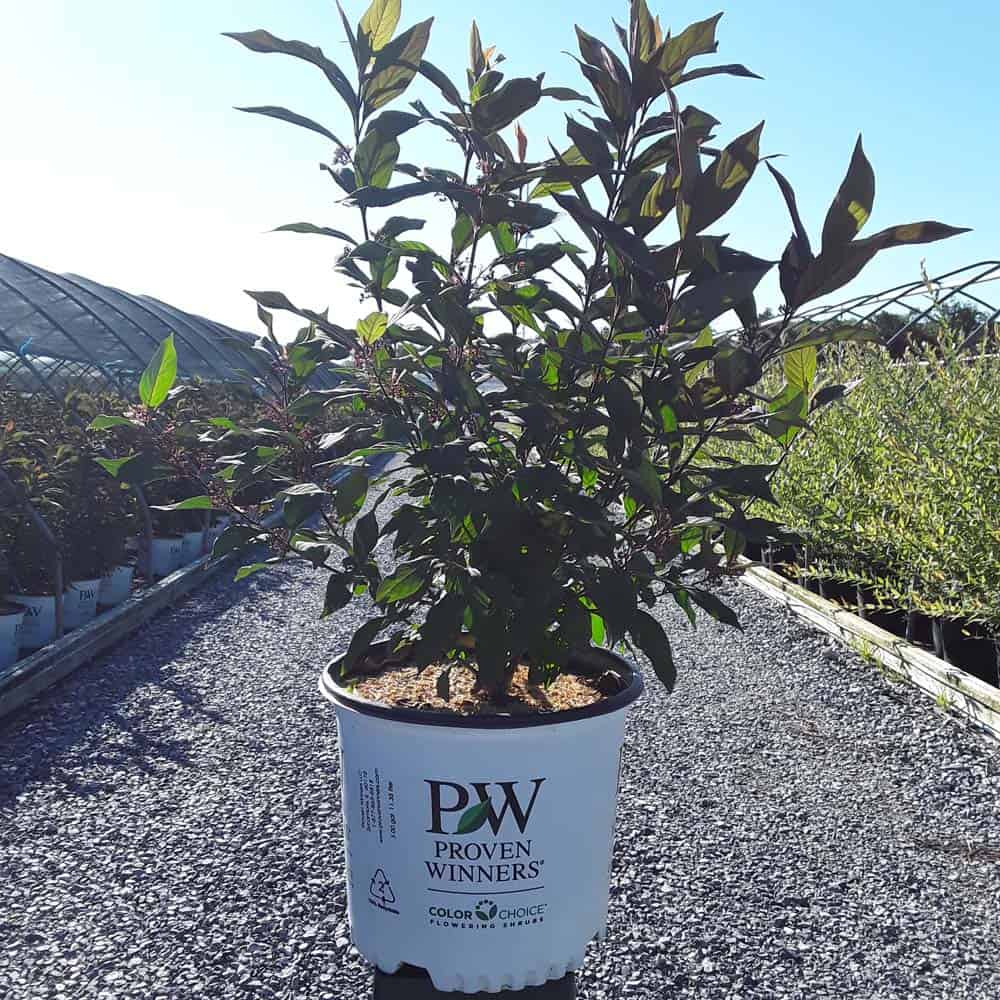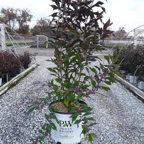 "A whole new look for callicarpa! No longer just planted for colorful fall fruit, this new hybrid variety has dark purple foliage to provide color all season. This vigorous, upright plant offers a unique look in the landscape or in containers. Developed by Dr. Tom Ranney of NCSU." -- Spring Meadows Nursery [Callicarpa]