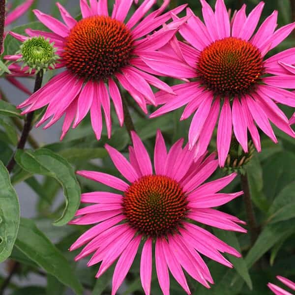 Pica Bella has narrow, mauve-pink petals surrounding a large deep orange cone. It blooms from early summer into the fall. [Echinacea]