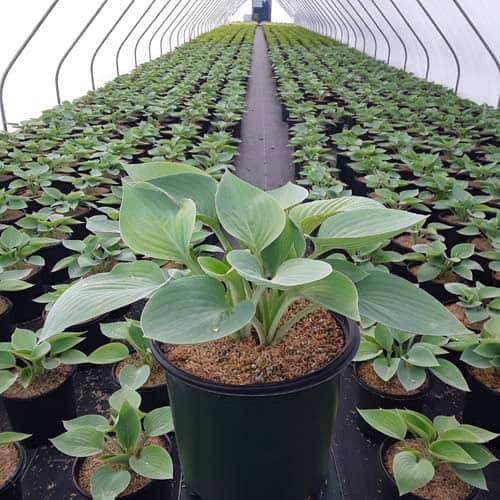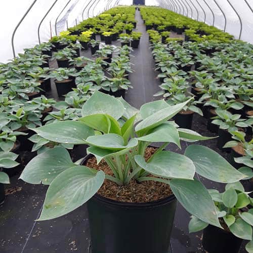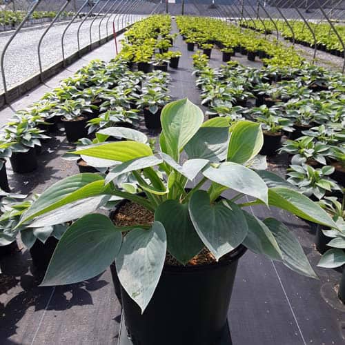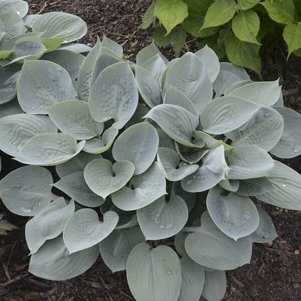 'Prairie Sky' has blue, lightly cupped leaves that keep their color all season long. Pale lavender flowers bloom in summer. [Hosta]