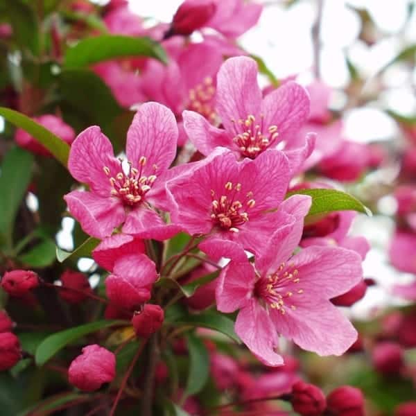 Large, spreading, deciduous, ornamental tree. Red flower buds open to a splash of pink blooms in spring. Glossy purple-red fruit lasts into winter. [Malus]
