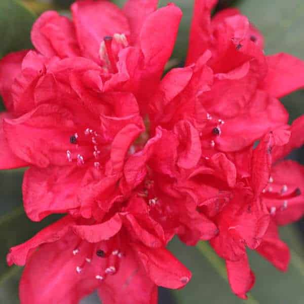 Reddish buds adorn this broad, spreading, evergreen all winter and emerge in early midseason to gorgeous, dark red flowers. Grows to about 4' and is a reliable grower. [Rhododendron]