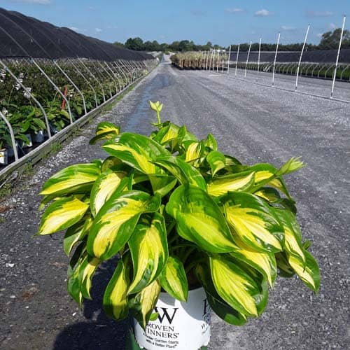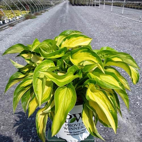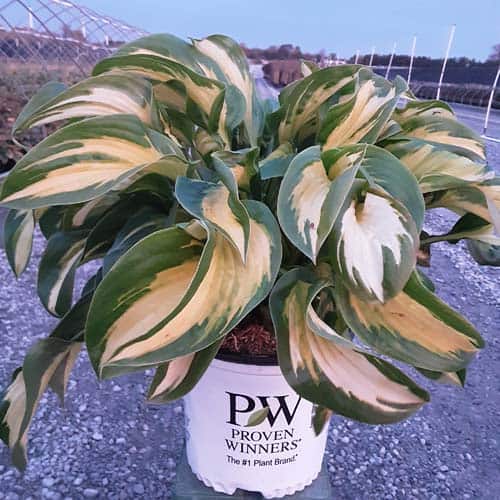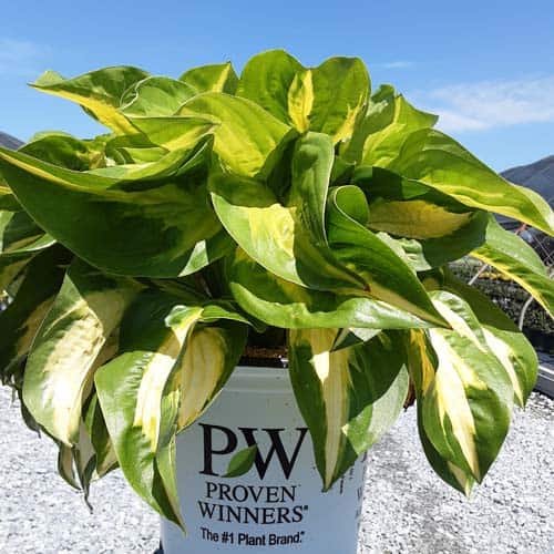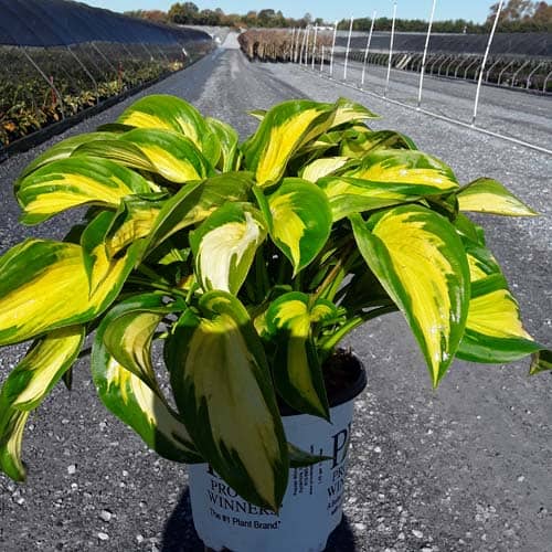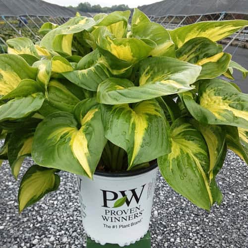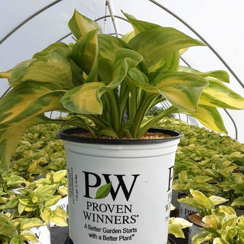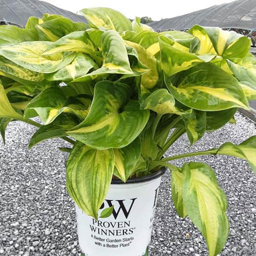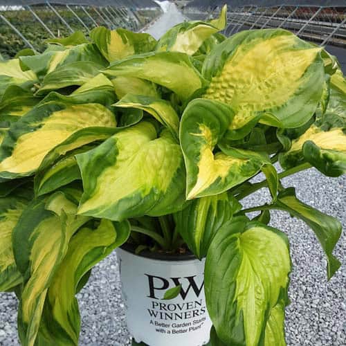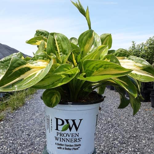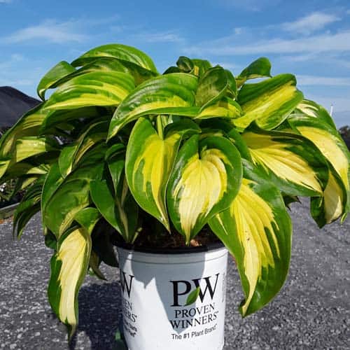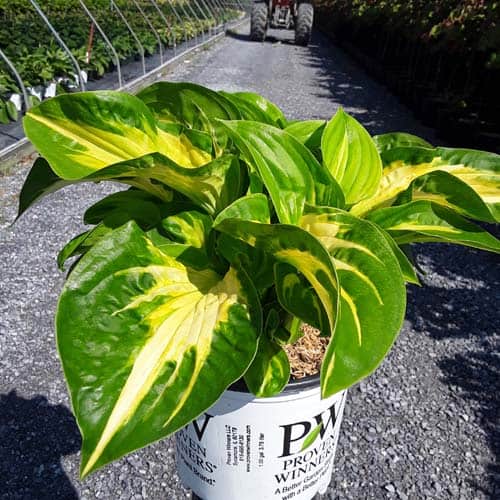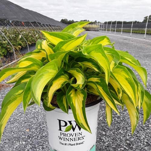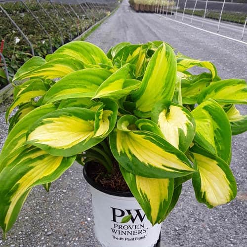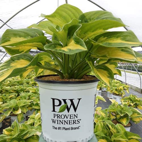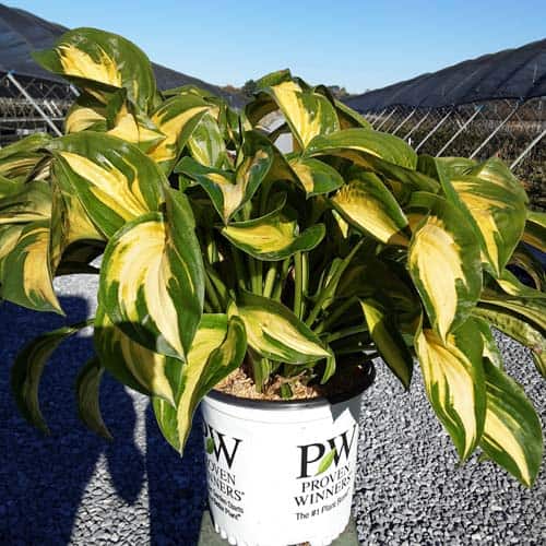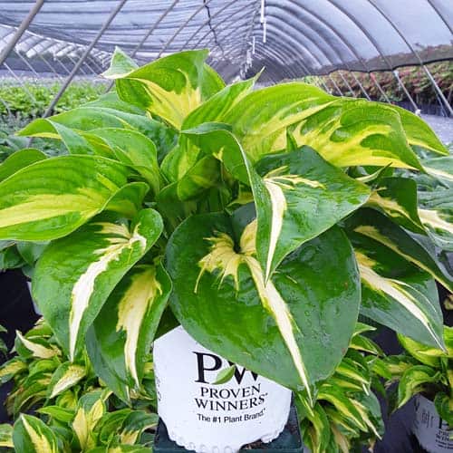 "Bring style and refinement to your hosta garden! Very wide, dark green margins contrast with a bright, brilliant yellow margin. Margins have puckering when plant is mature. Near-white flowers." Proven Winners [Hosta]