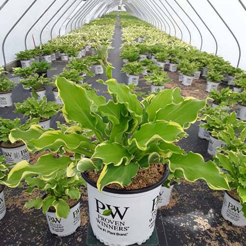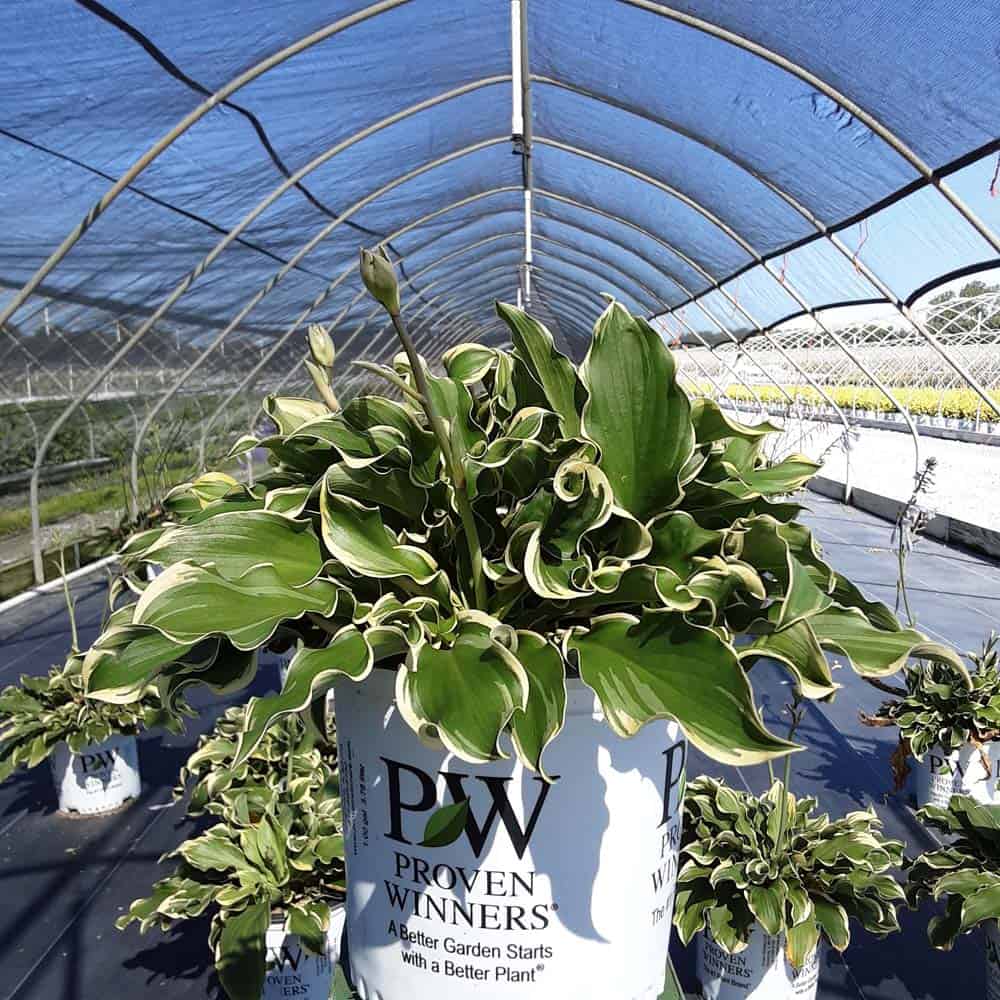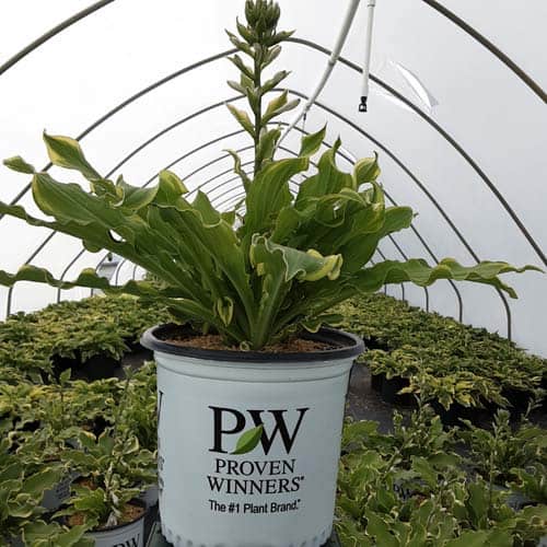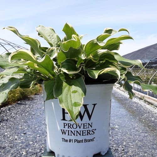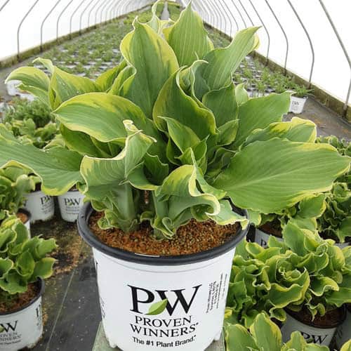 "This delightfully fun, extremely ruffled hosta makes a distinctive specimen in shade gardens and containers. Its green leaves have cream margins which widen as the plants mature, and the leaves are of good substance, making them more slug resistant. Light lavender flowers appear midseason." Proven Winners [Hosta]