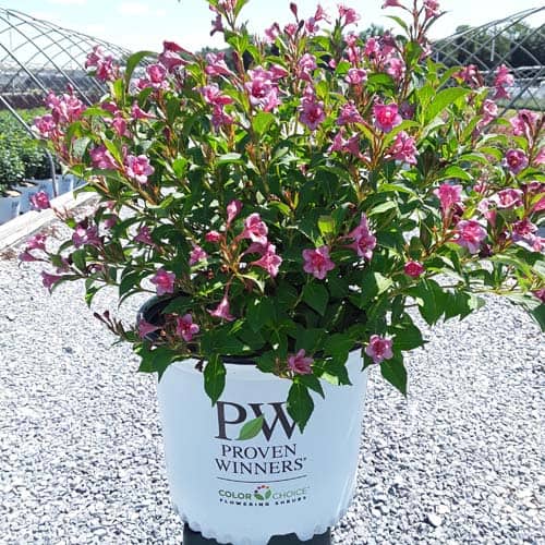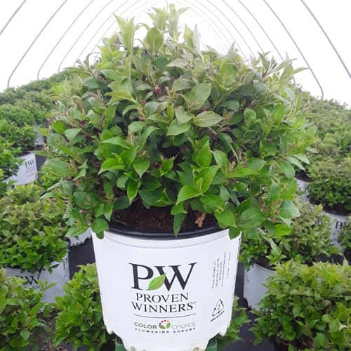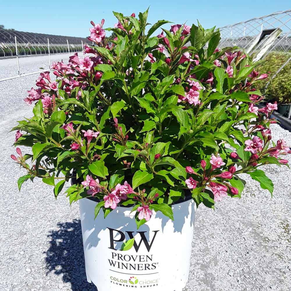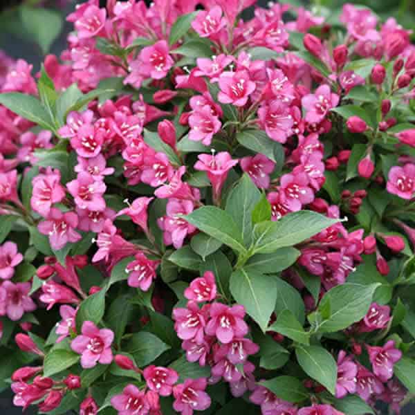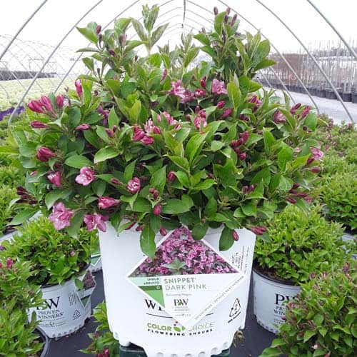 "Snippet® Dark Pink weigela is a hardy dwarf selection from the Czech Republic with richer, dark pink flower color than 'Pink Poppet' or 'Minuet'. It reblooms quite nicely and can be cycle-pruned to deliver a flowering crop to retail through the garden season." Spring Meadow Nursery [Weigela]