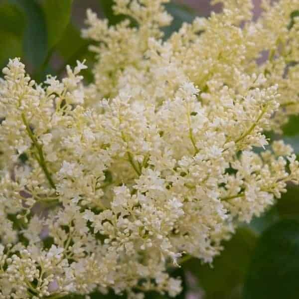 Huge clusters of fragrant, creamy-white flowers bloom in early summer on this large shrub or small lilac tree that grows to about 20 feet. The blossoms change to tan capsules that last into the winter months. The unique exfoliating bark is shiny, reddish brown. A beautiful specimen tree that is drought resistant and disease free. [Syringa]