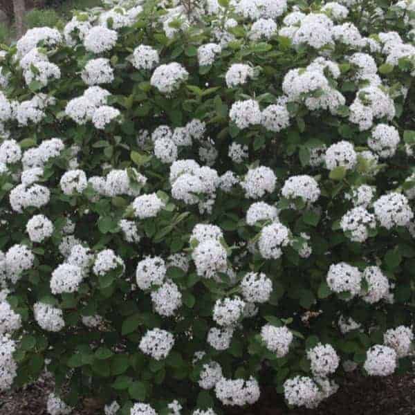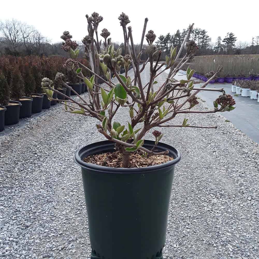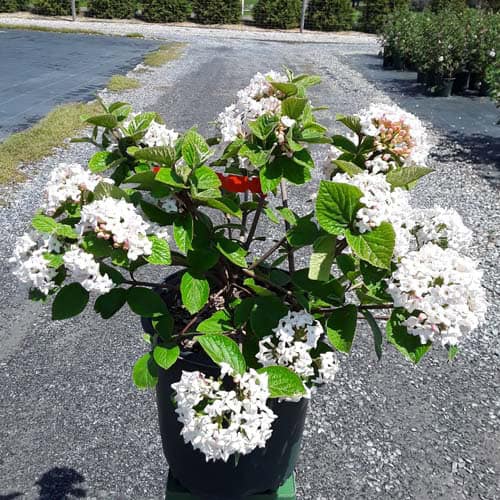 "Delightfully fragrant, pink buds open to white snowball-like clusters. And unlike many viburnum carlesii, this variety blooms with its leaves fully expanded as a backdrop, enhancing the beauty of the flowers. And as the warm summer breezes make way for crisp autumn air, Spice Island’s™ leaves turn to brilliant shades of burgundy and glowing red." Plants Nouveau [Viburnum]