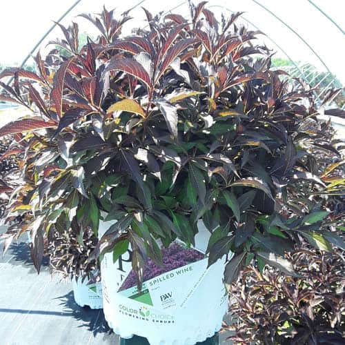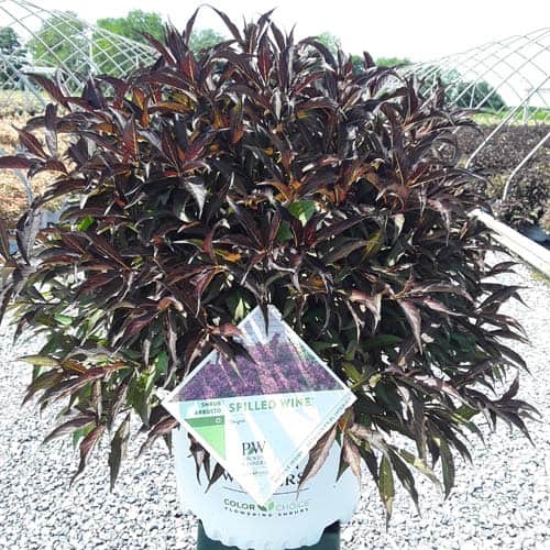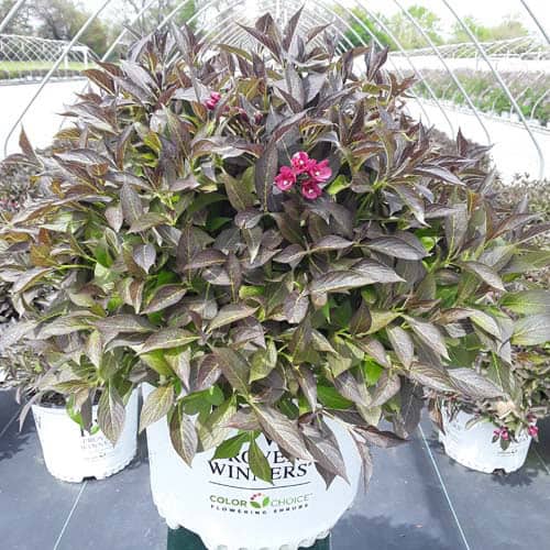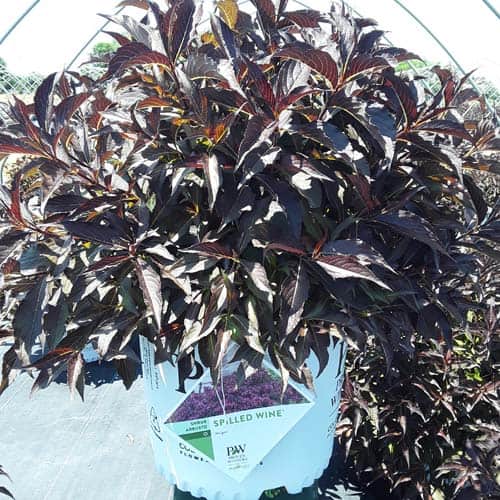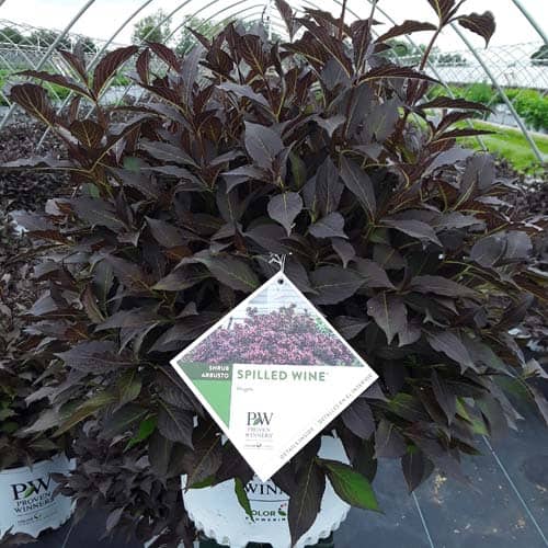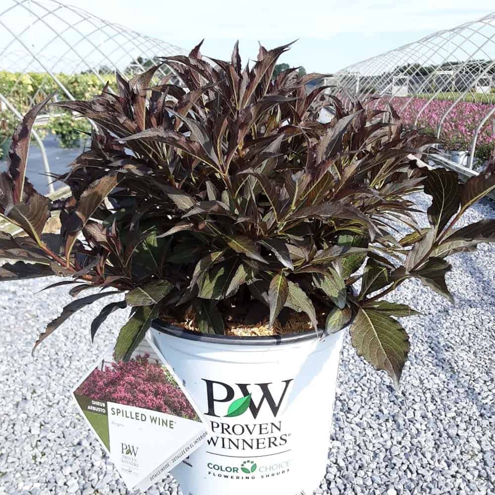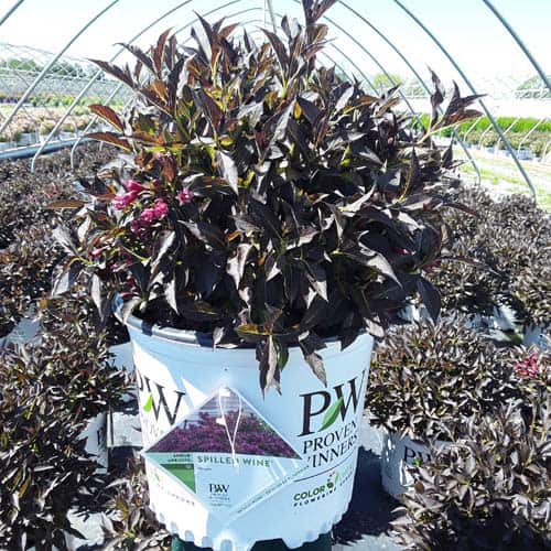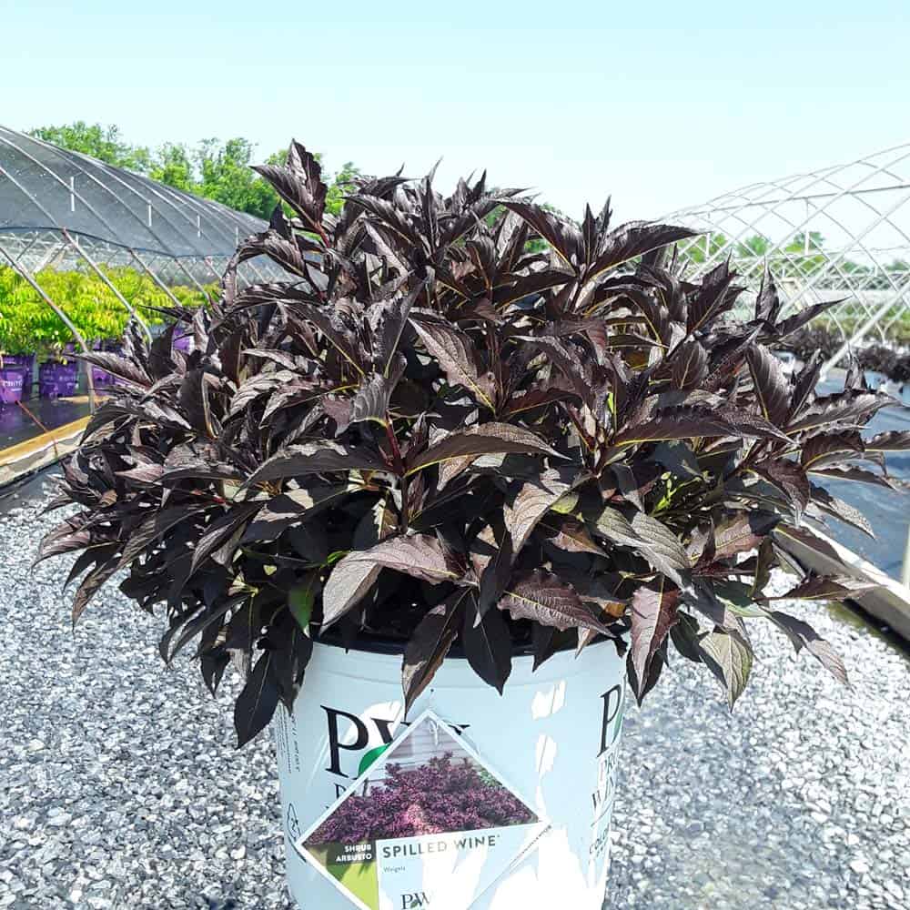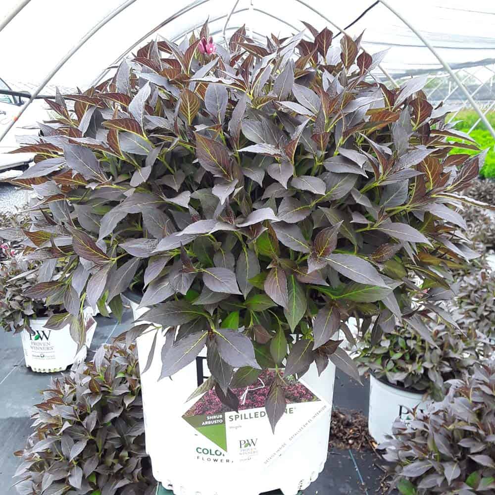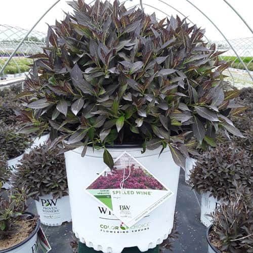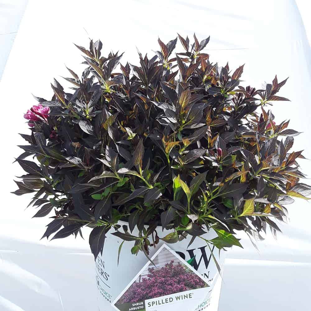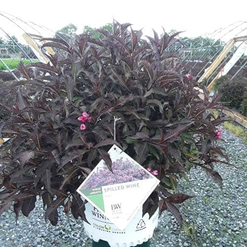 "The new look purple leaved weigela! Spilled Wine has dark red, wavy leaves and a spreading habit. Its hot pink-magenta flowers are similar to those of Wine & Roses, but this is a smaller plant that is wider than it is tall. This is a wonderful plant for adding lots of color in mass plantings, or tucked into an existing border." -- Spring Meadow Nursery [Weigela]