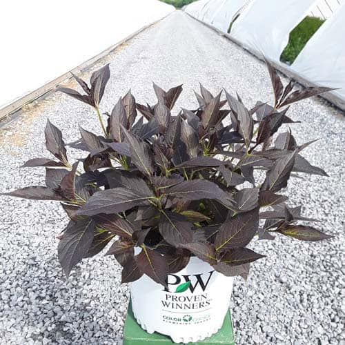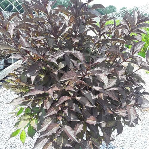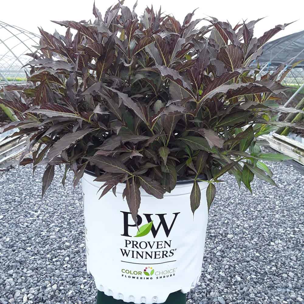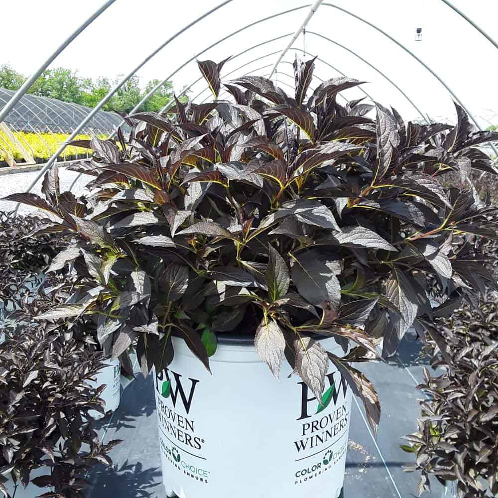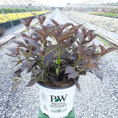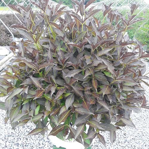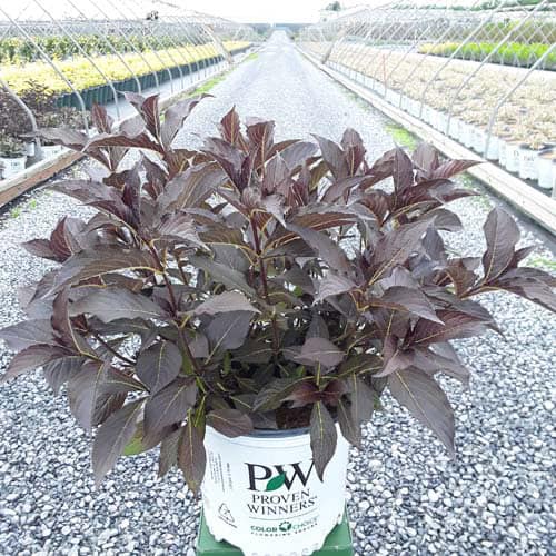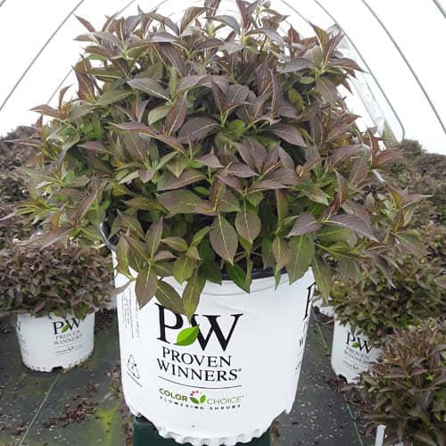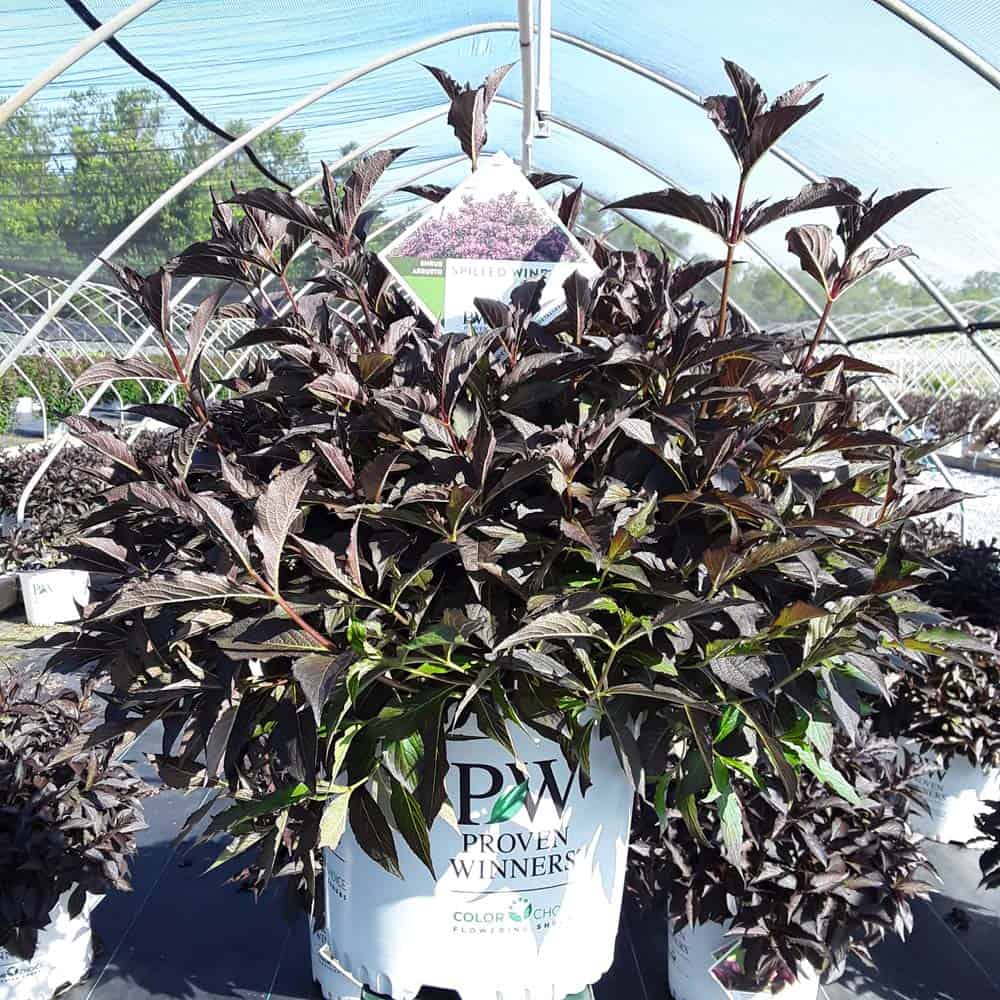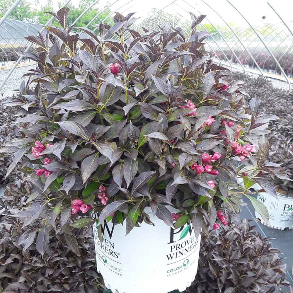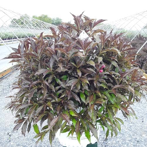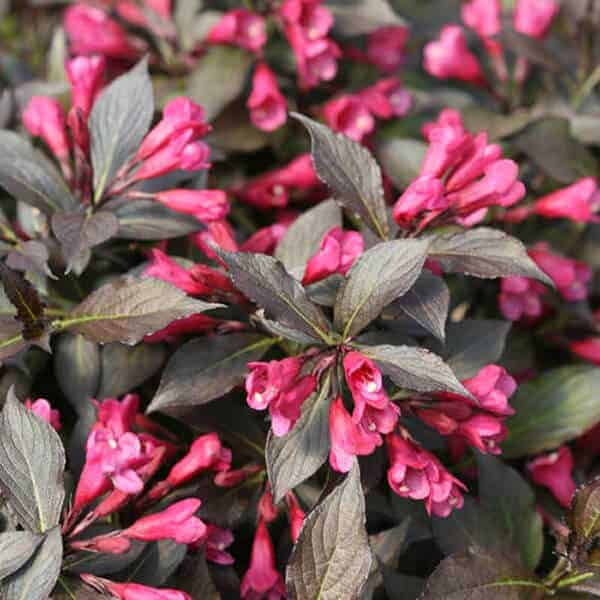 "The new look purple leaved weigela! Spilled Wine has dark red, wavy leaves and a spreading habit. Its hot pink-magenta flowers are similar to those of Wine & Roses, but this is a smaller plant that is wider than it is tall. This is a wonderful plant for adding lots of color in mass plantings, or tucked into an existing border." -- Spring Meadow Nursery [Weigela]