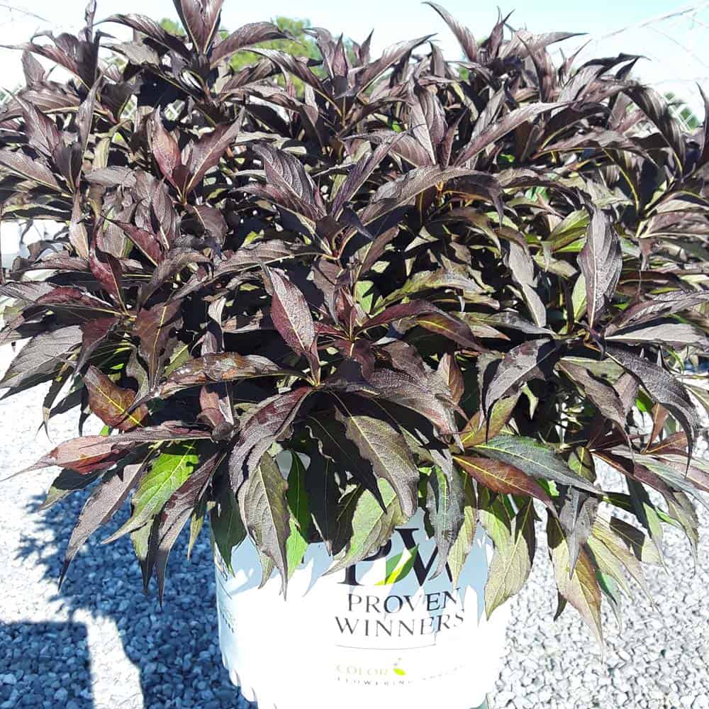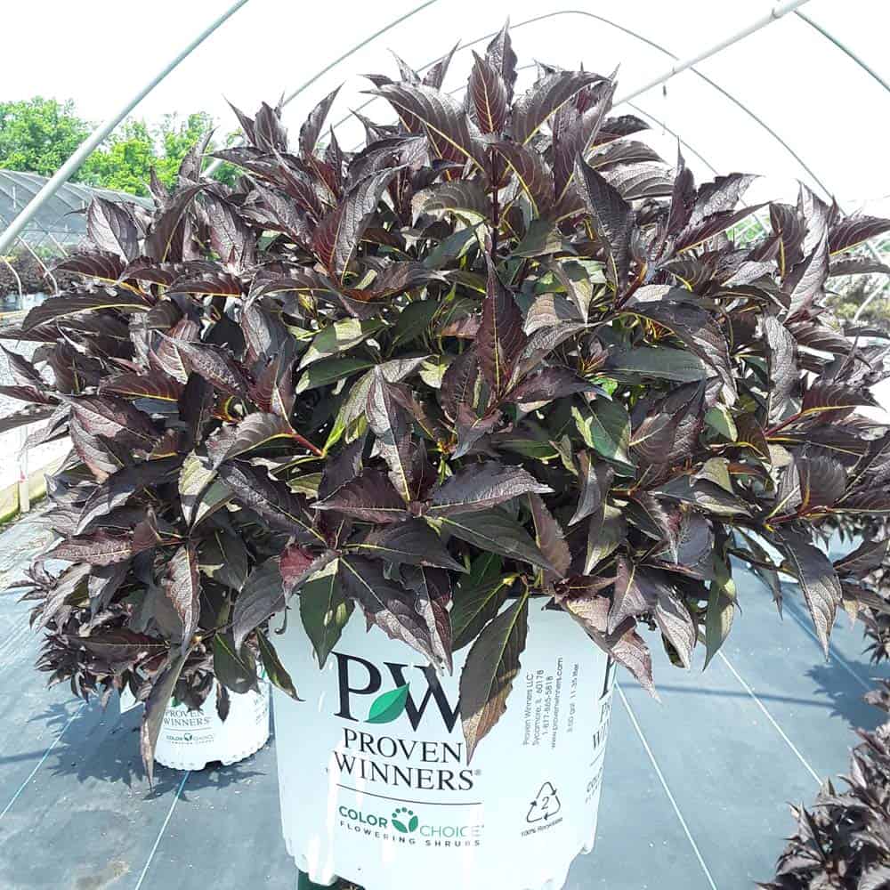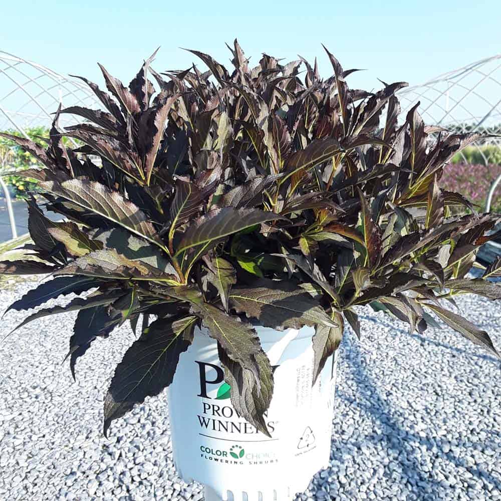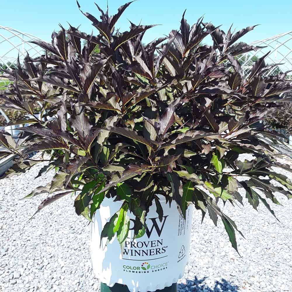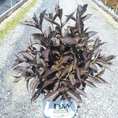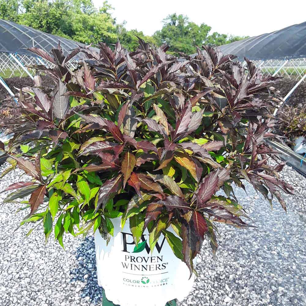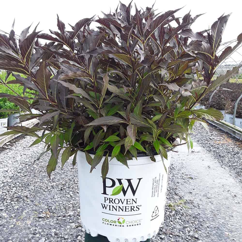 "The new look purple leaved weigela! Spilled Wine has dark red, wavy leaves and a spreading habit. Its hot pink-magenta flowers are similar to those of Wine & Roses, but this is a smaller plant that is wider than it is tall. This is a wonderful plant for adding lots of color in mass plantings, or tucked into an existing border." -- Spring Meadow Nursery [Weigela]