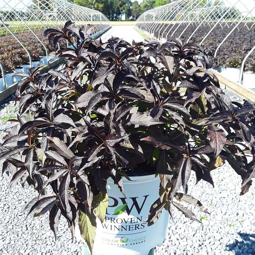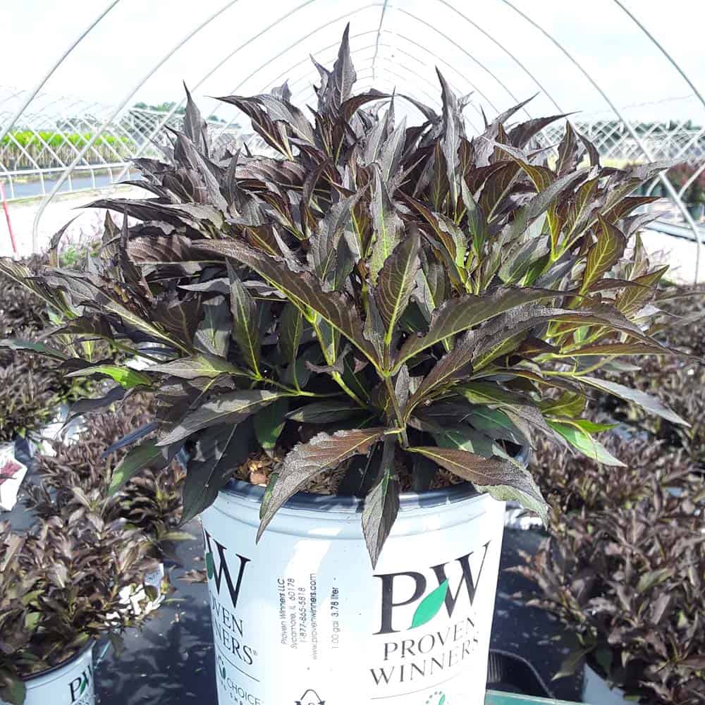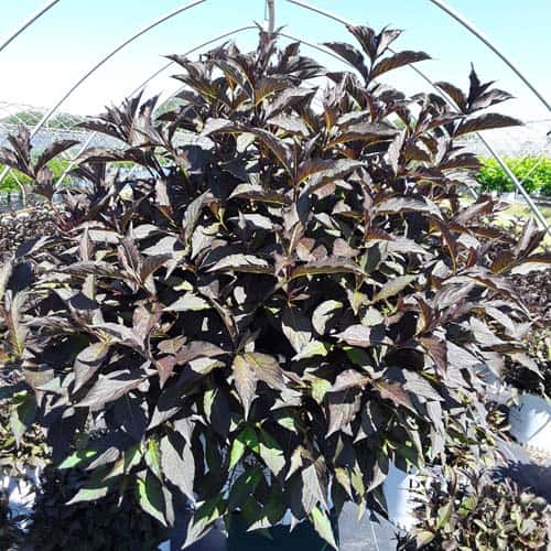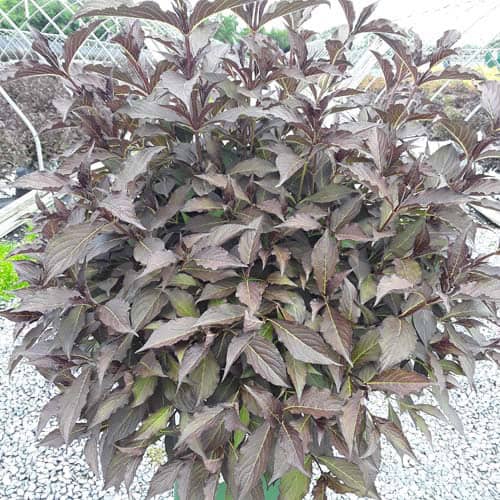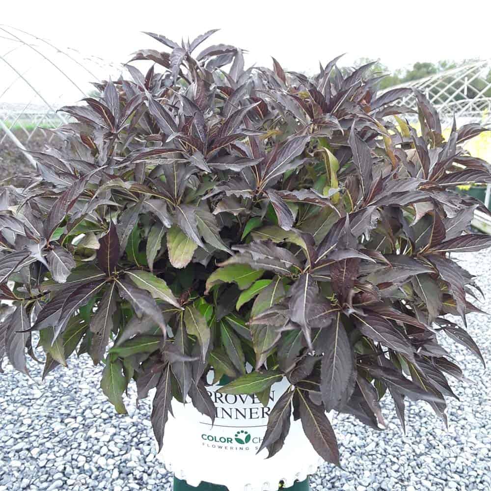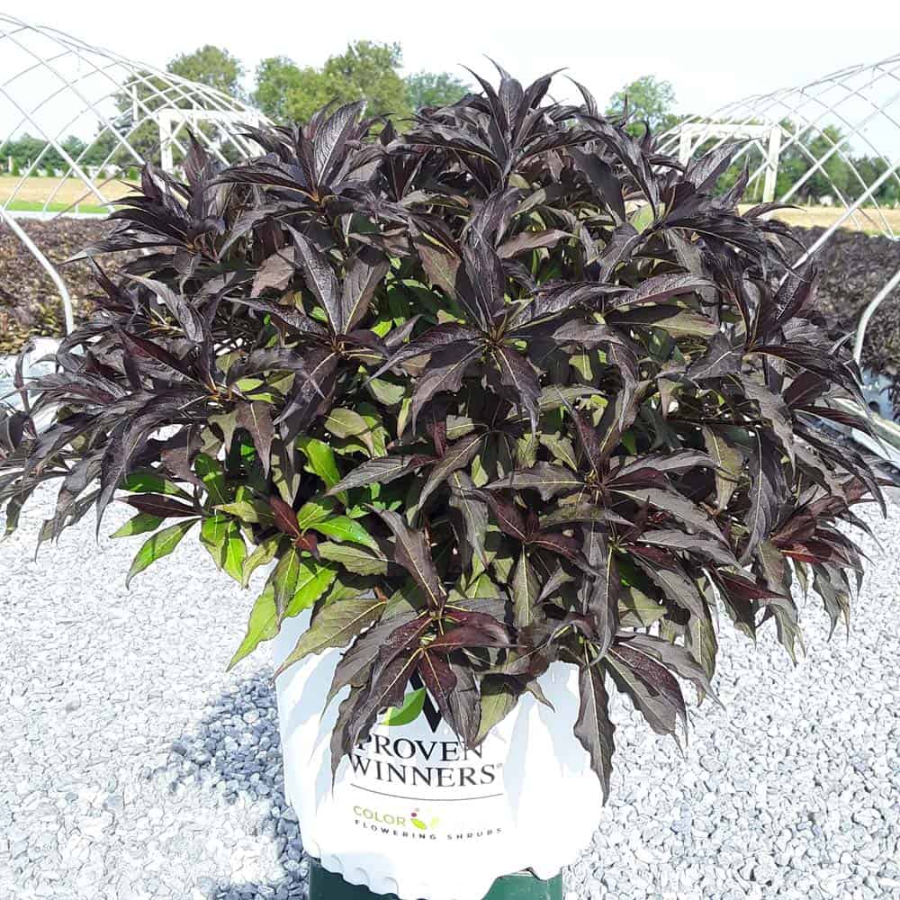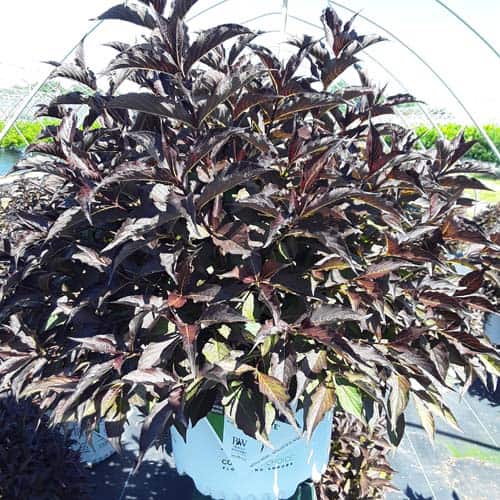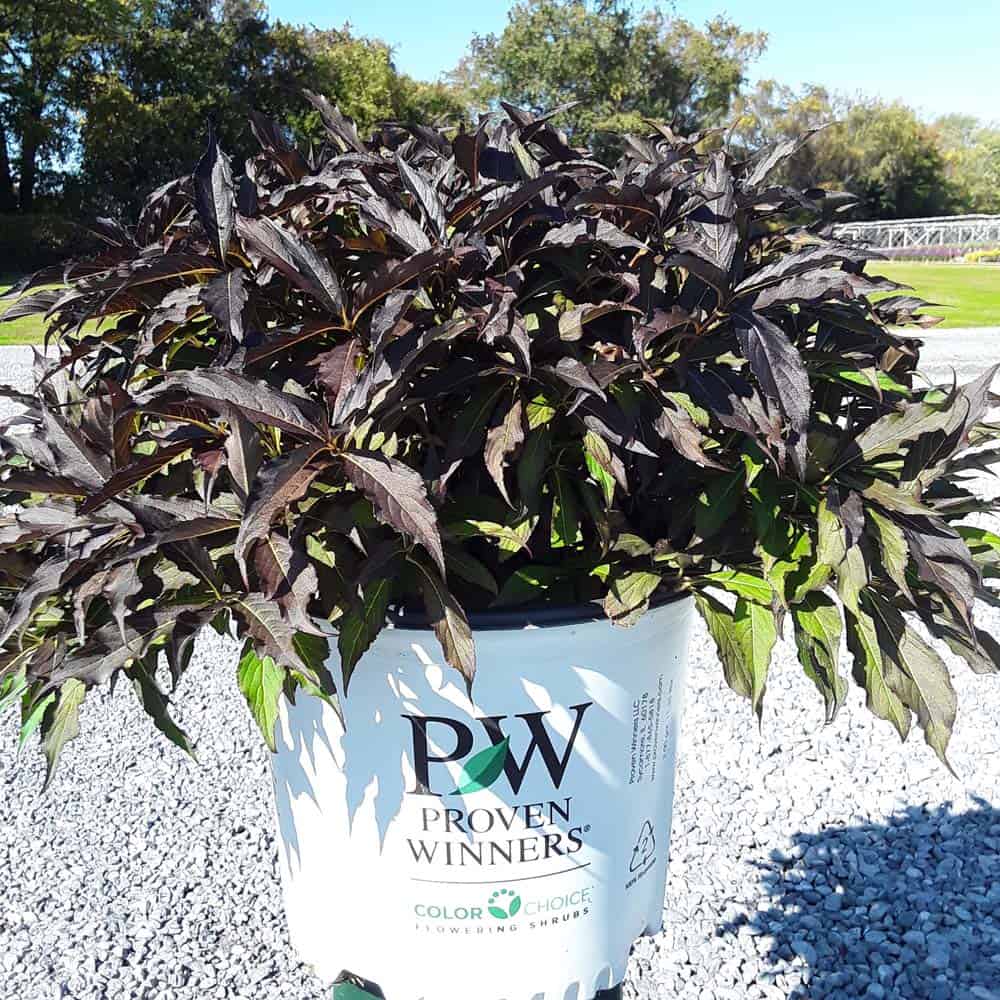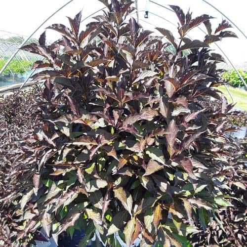 "The new look purple leaved weigela! Spilled Wine has dark red, wavy leaves and a spreading habit. Its hot pink-magenta flowers are similar to those of Wine & Roses, but this is a smaller plant that is wider than it is tall. This is a wonderful plant for adding lots of color in mass plantings, or tucked into an existing border." -- Spring Meadow Nursery [Weigela]