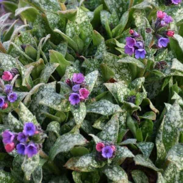 "Unique salmon pink buds transition to rich blue flowers. Silver speckling dusts the green leaves. Its attractive foliage can be enjoyed after the spring flowers are finished." Proven Winners [Pulmonaria]