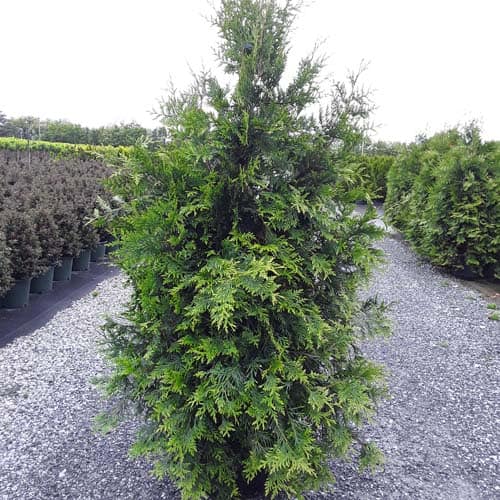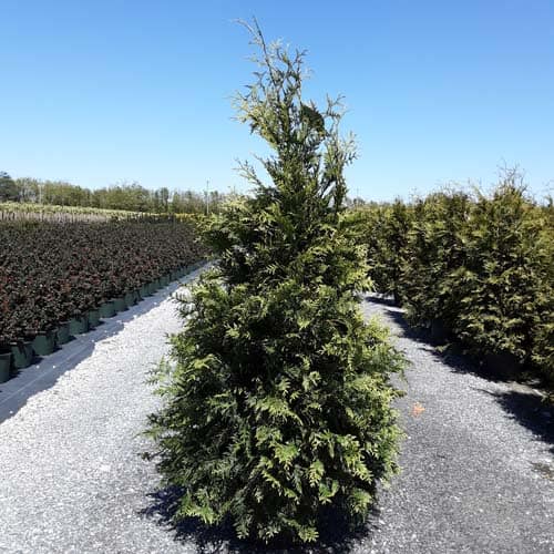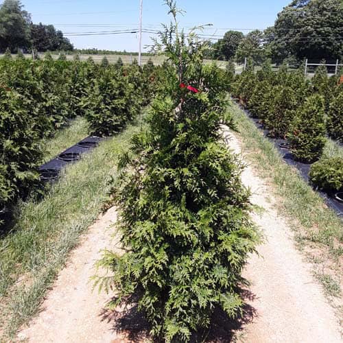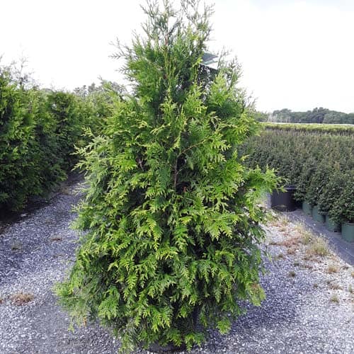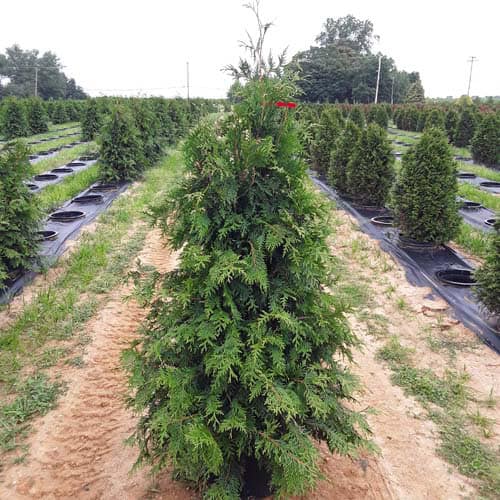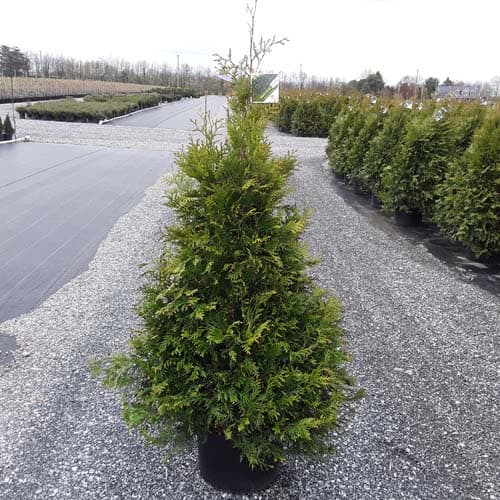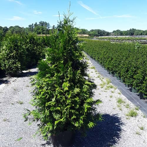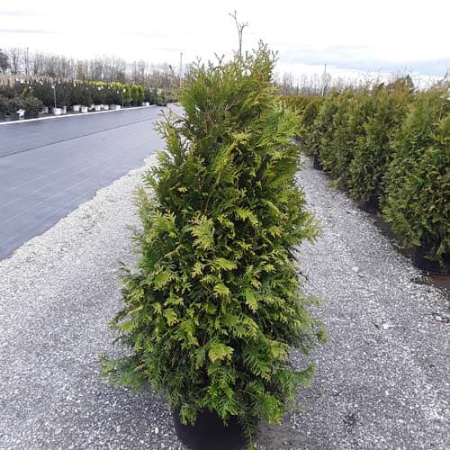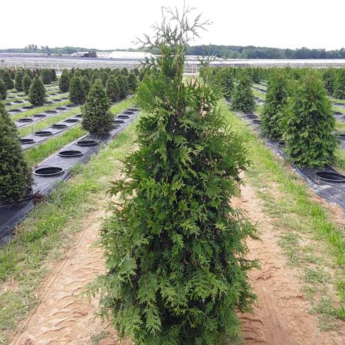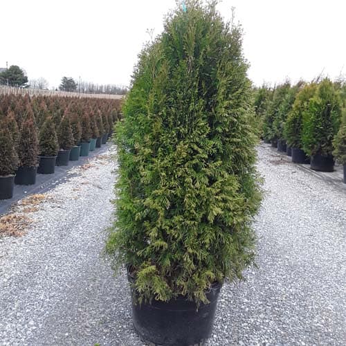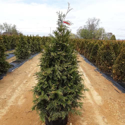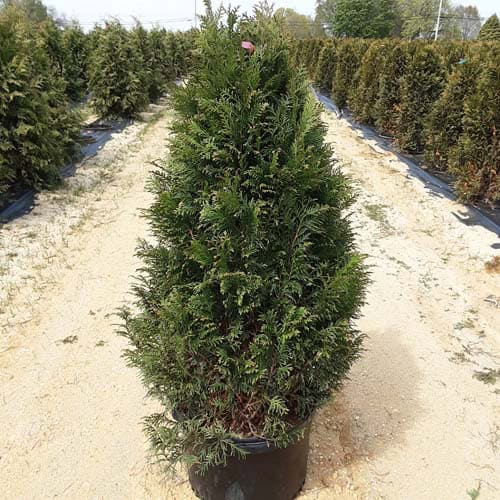 "This fast growing, cold hardy selection of Western Arborvitae shows excellent resistance to deer browsing. It was selected for its superior winter color and hardiness. It maintains a dark green, glossy color even in Midwest winters. The tight pyramidal habit works nicely in landscape designs. A good choice for many suburban locations, especially for creating fast-growing privacy screens." -- Spring Meadow Nursery [Thuja]
