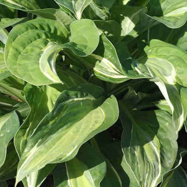 Dark green leaf with a creamy-yellow middle accented by a thin white strip separating the green and yellow areas, violet flowers. Dramatic foliage has dark green leaves with a prominent, yellow with white, band in the center of the leaf. Ideal for any shady garden spot. [Hosta]
