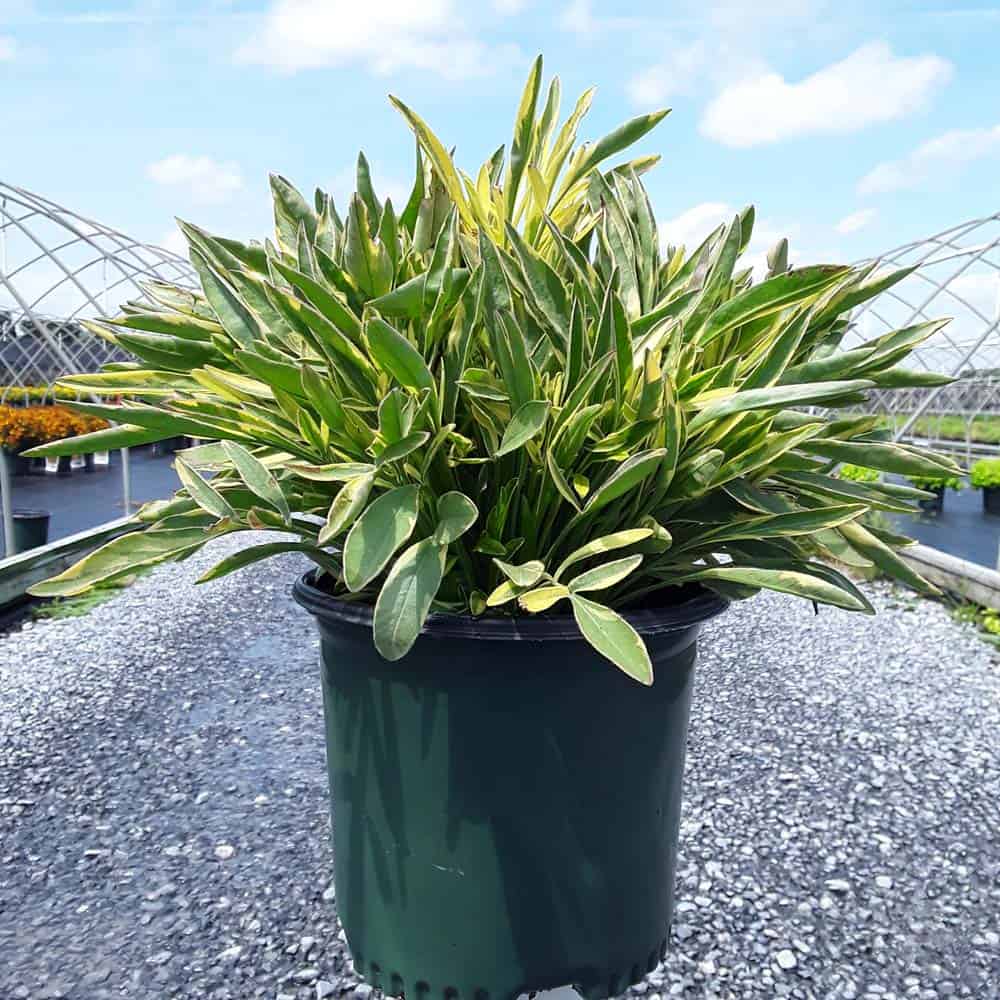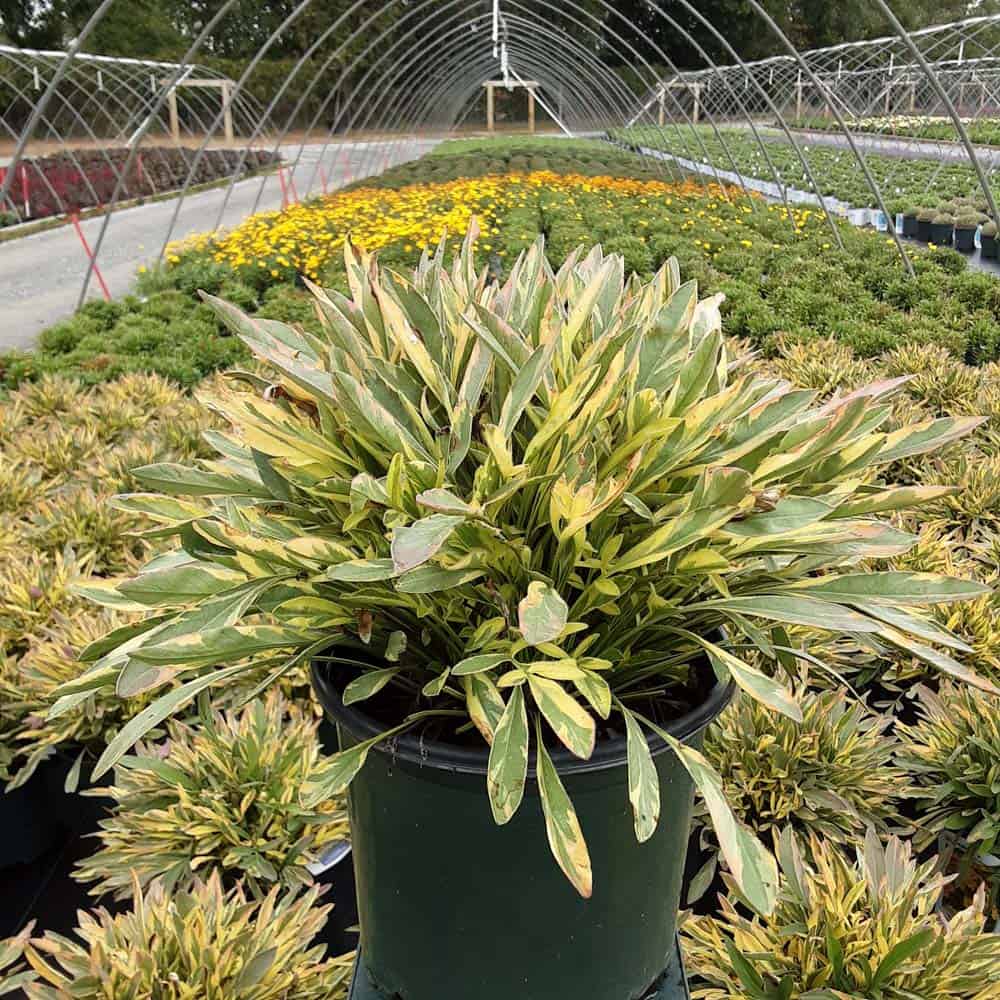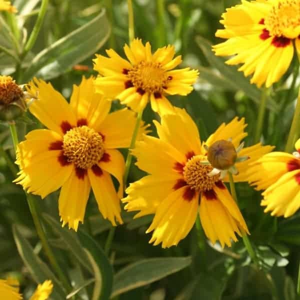 Cheery, daisy-like flowers with vivid yellow petals and central maroon markings bloom above lovely green and yellow variegated foliage. [Coreopsis]