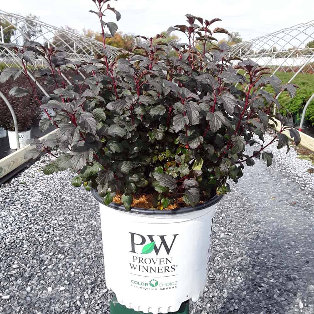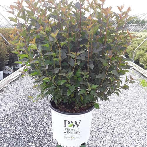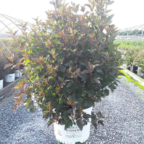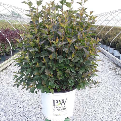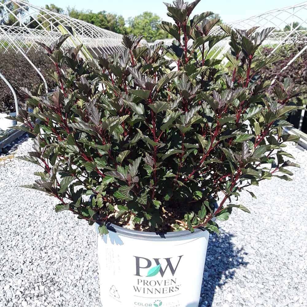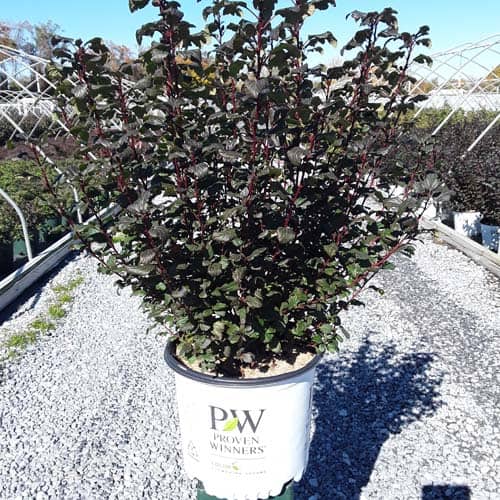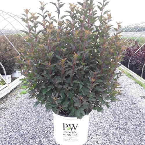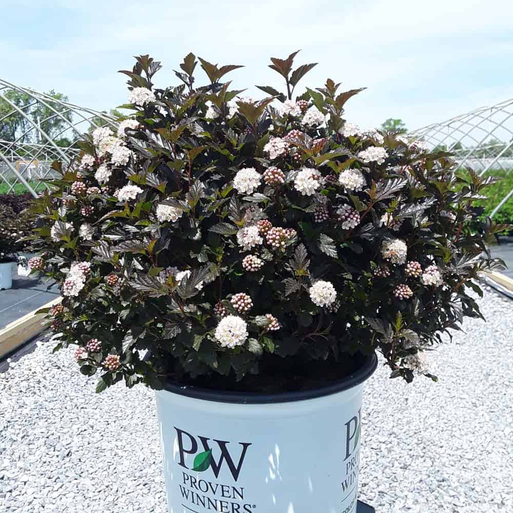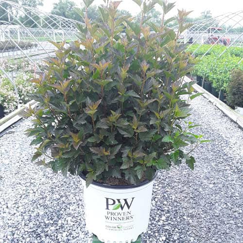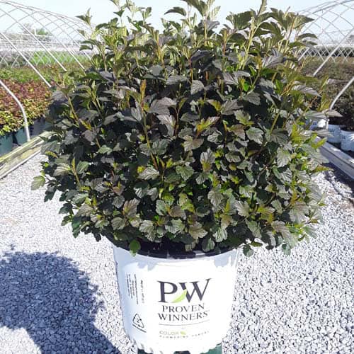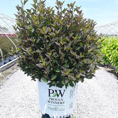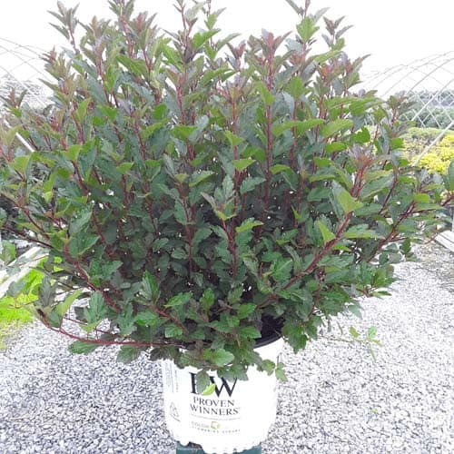 "A new dwarf ninebark that is smaller than others on the market. Tiny Wine is extra bushy, with small, refined leaves. The dark bronze-maroon foliage is colorful all season, and contrasts beautifully with the white flowers in late spring. The flower show is exceptional, with dainty flowers blooming up and down the stem in a very showy display. This plant will provide a lot of low-maintenance color in a very small space." -- Spring Meadow Nursery [Physocarpus]
