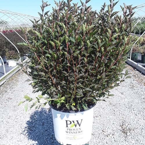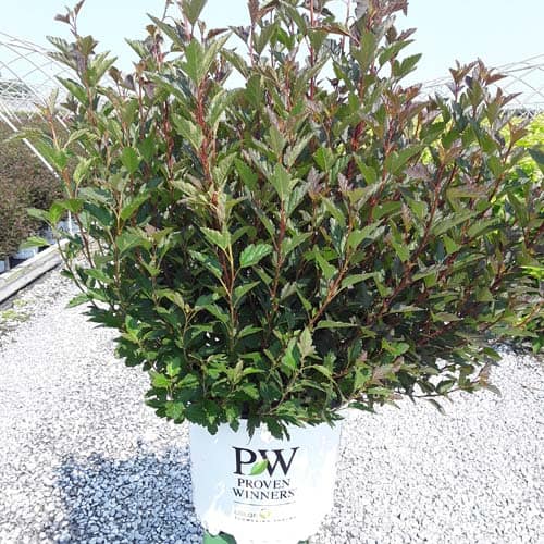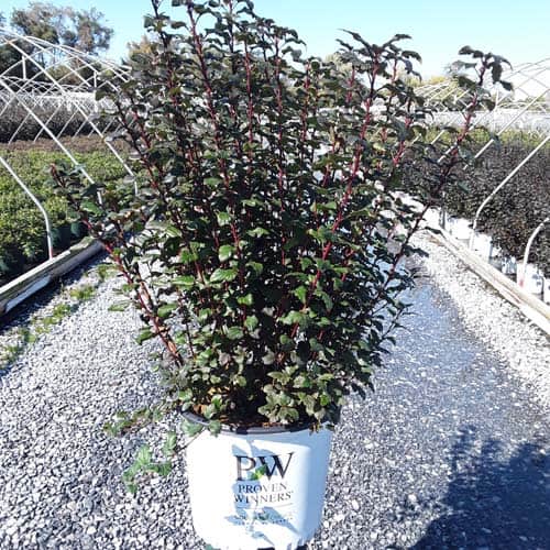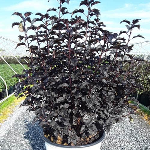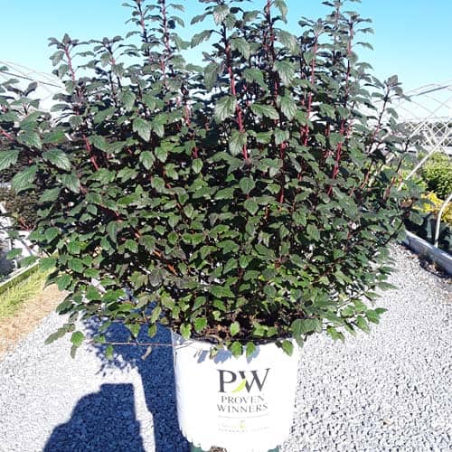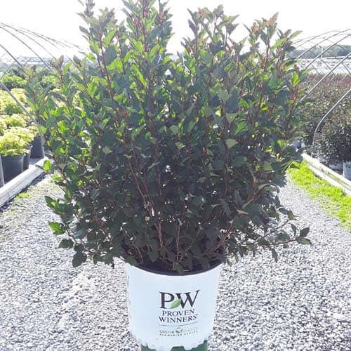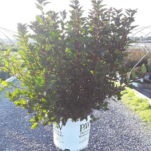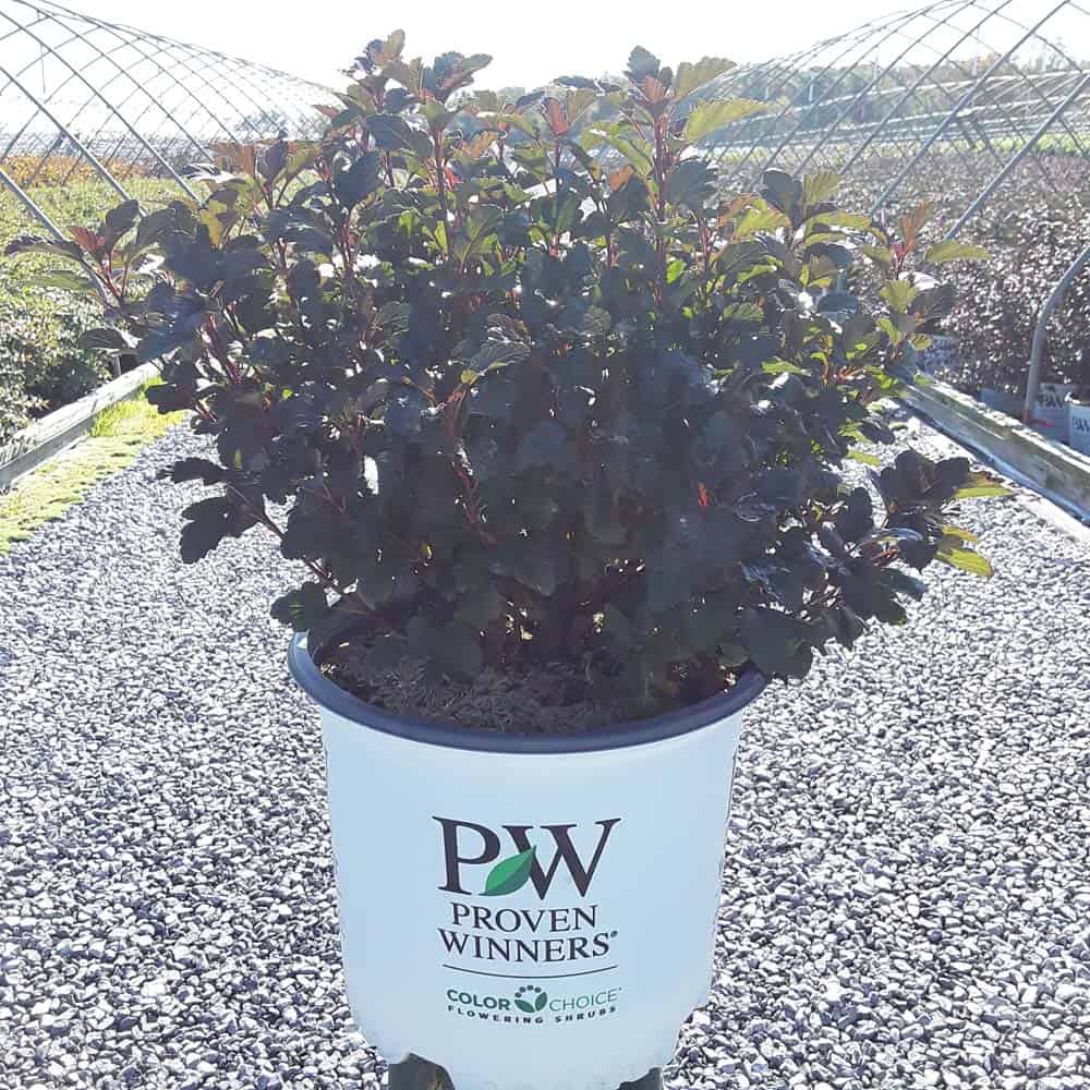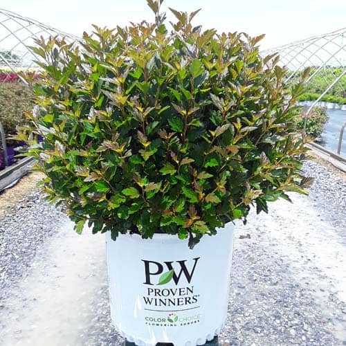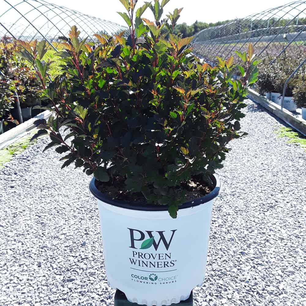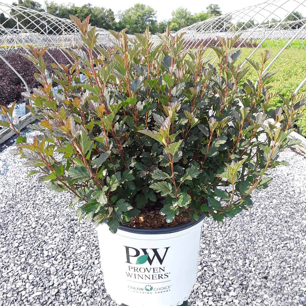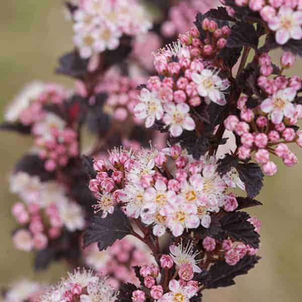 "A new dwarf ninebark that is smaller than others on the market. Tiny Wine is extra bushy, with small, refined leaves. The dark bronze-maroon foliage is colorful all season, and contrasts beautifully with the white flowers in late spring. The flower show is exceptional, with dainty flowers blooming up and down the stem in a very showy display. This plant will provide a lot of low-maintenance color in a very small space." -- Spring Meadow Nursery [Physocarpus]