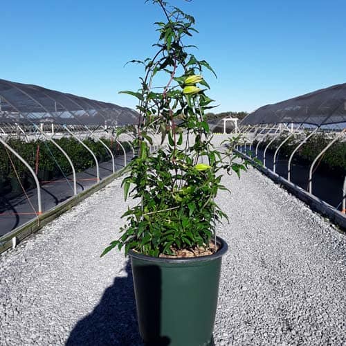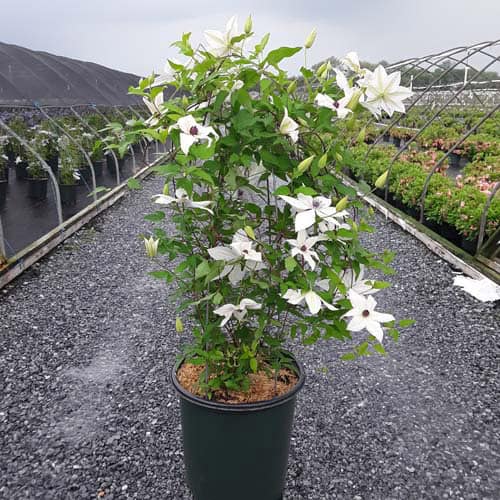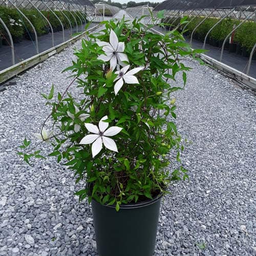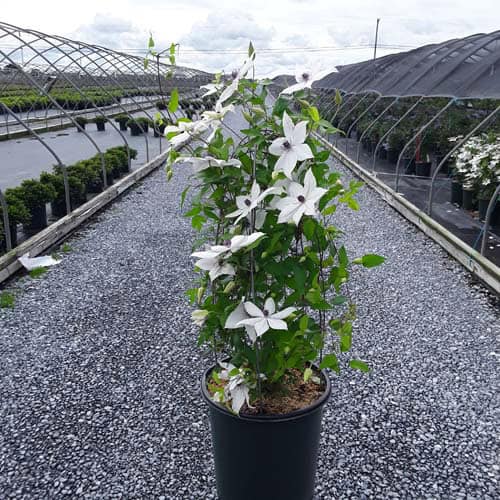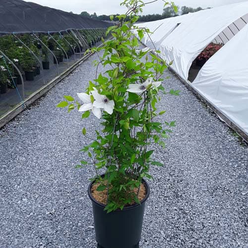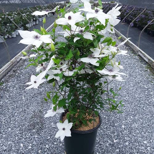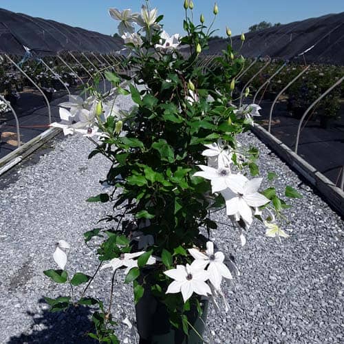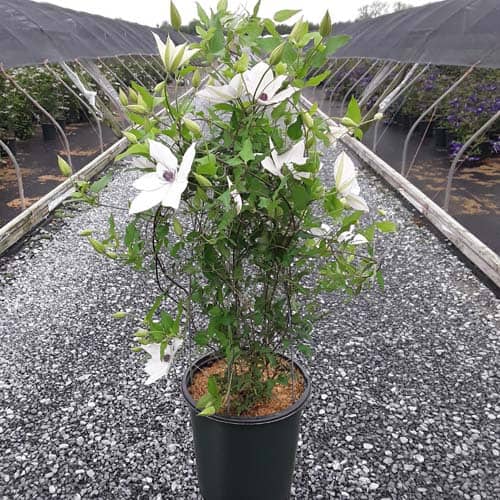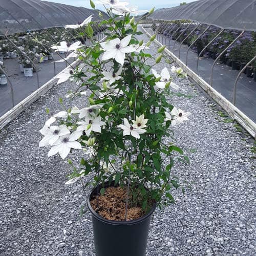 "Tsukiko™ Evipo110(N) is an outstanding free-flowering white variety with a long flowering season. Tsukiko starts flowering at typically 20" (50cm) from soil level and continues to flower until its final height of 6 ft. (180cm). A superb plant for growing in a container or up into the base of roses or shrubs growing on an archway or pergola. Easy to grow and cultivate." - Raymond Evison [Clematis]
