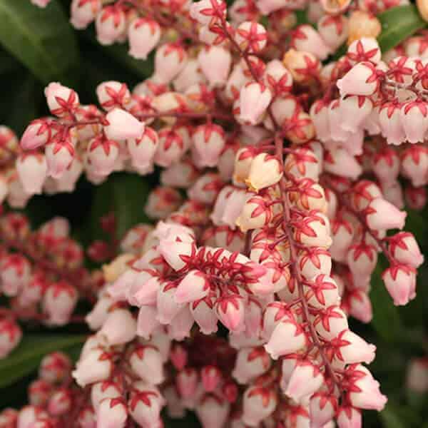 Compact evergreen shrub with spring blooming, silvery rose flowers fading to white. Glossy dark green leaves retain their color in winter. Excellent specimen plant. [Pieris]