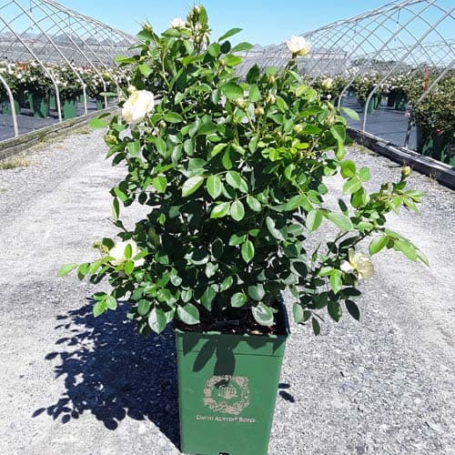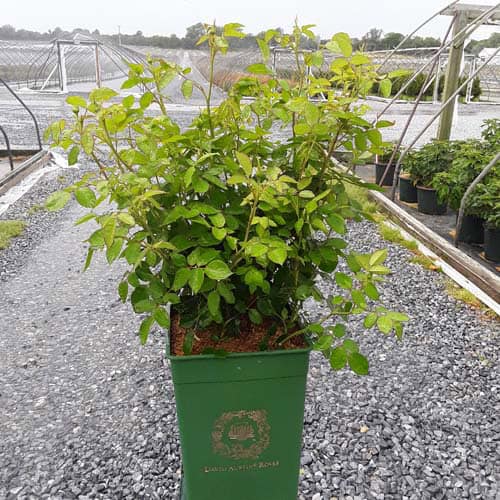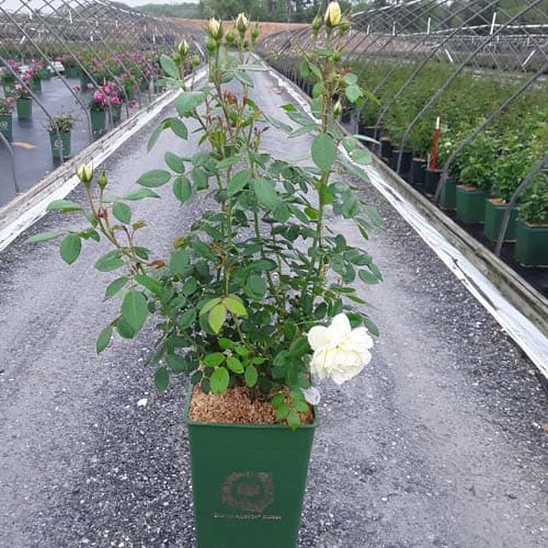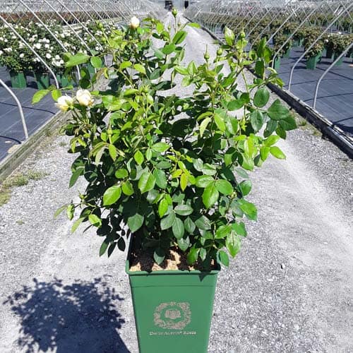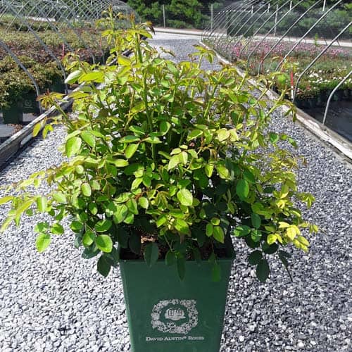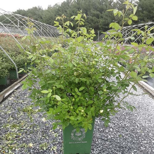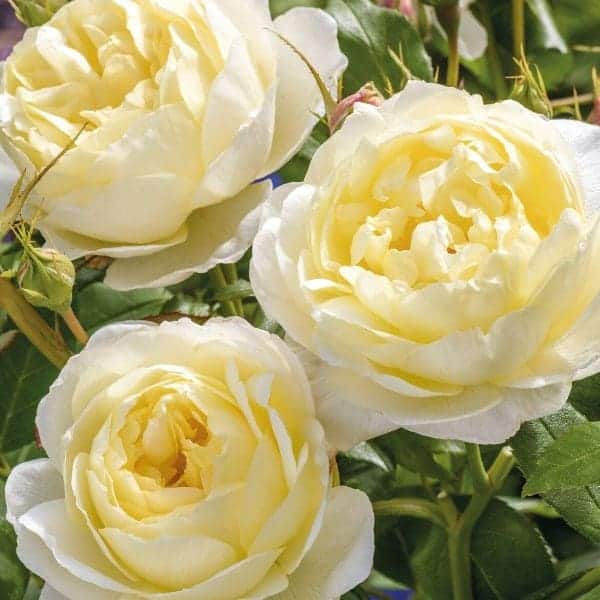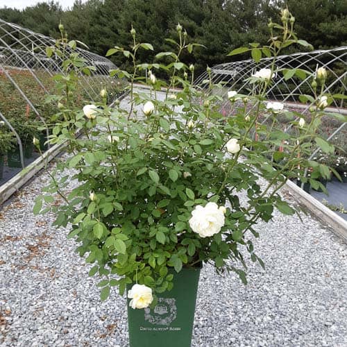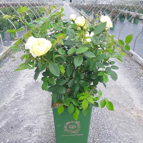 "Pink-tinged buds open to medium-sized cups held in large clusters. Pale yellow, paling to white at the edges; each has a rich yellow eye. The fragrance is similar to green tea with aspects of lemon and honey. It forms a bushy, upright shrub." David Austin Roses [Rosa]