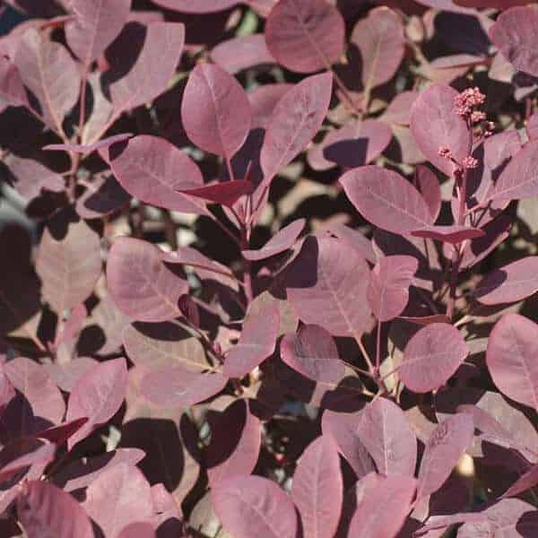 Deciduous shrub with dark purple foliage that turns claret-purple in fall. Small yellow flowers in summer followed by airy, smoke-like, seed clusters. [Cotinus]