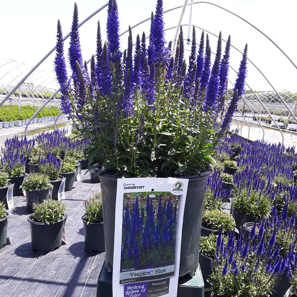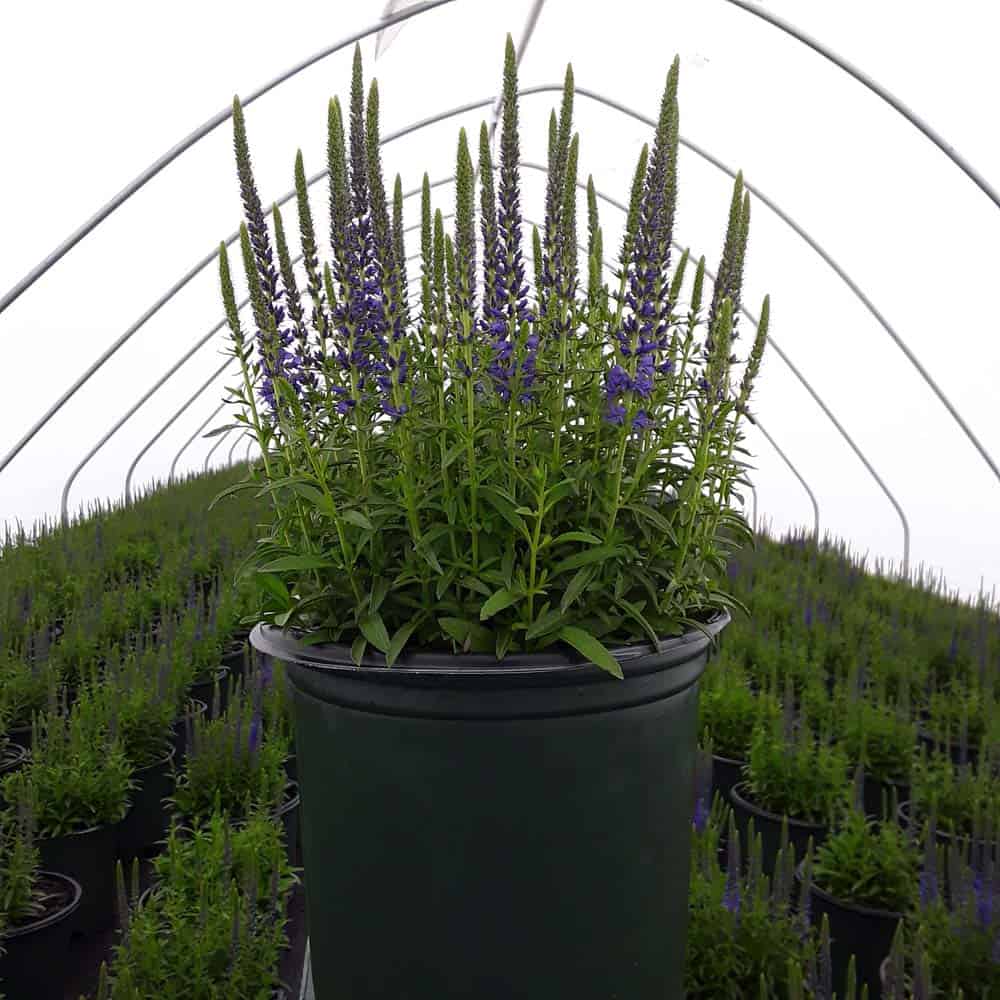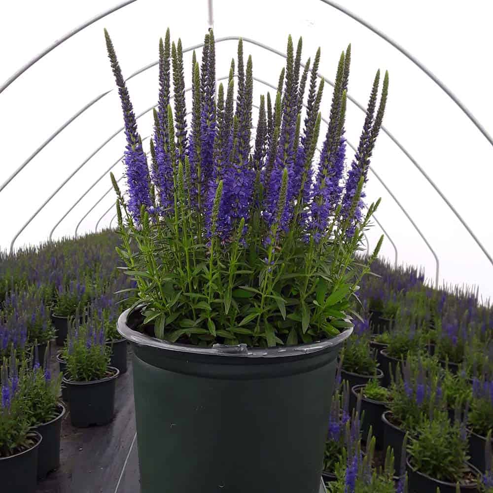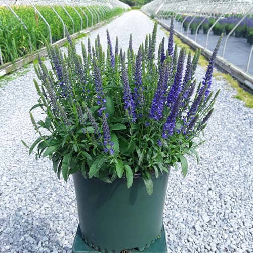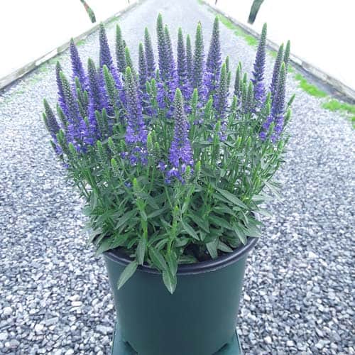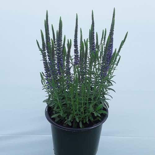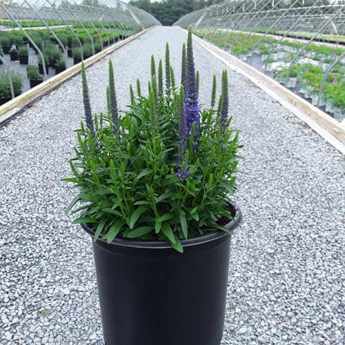 Masses of blue flower spikes on a compact habit attract butterflies and other pollinators. A very hardy cultivar perfect for edging, mixed borders, walkways, and cutting gardens. [Veronica]