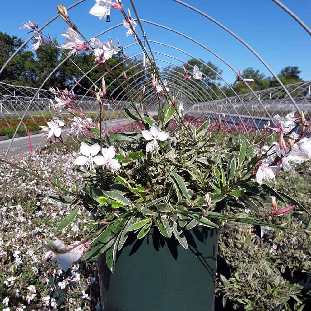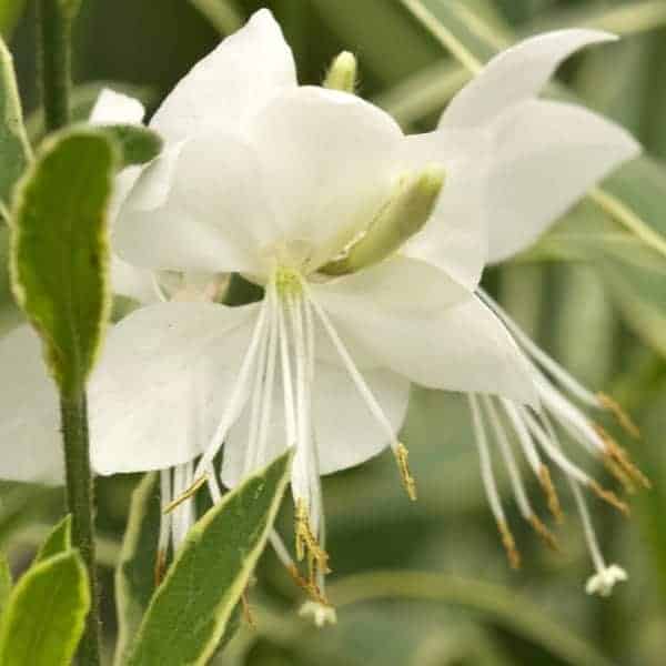 Clear white blooms accent the variegated green and white foliage on this compact, long flowering variety. [Gaura]