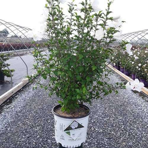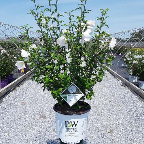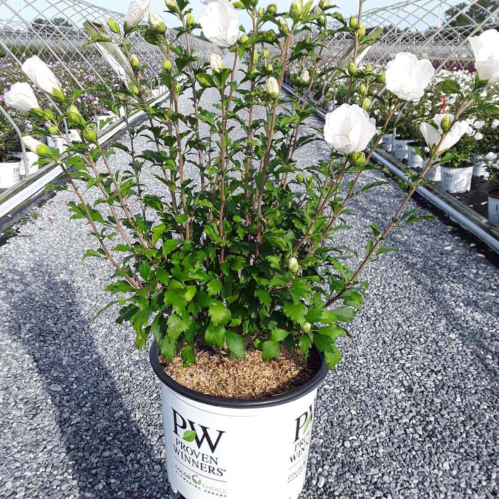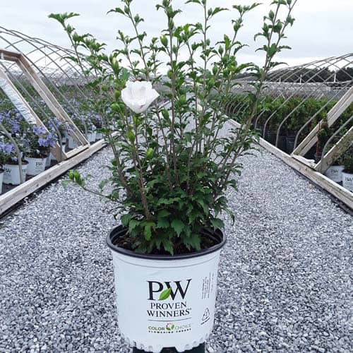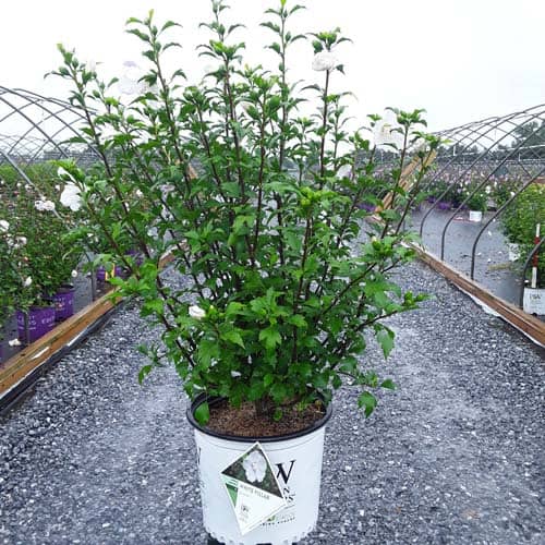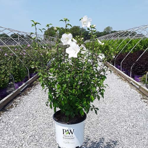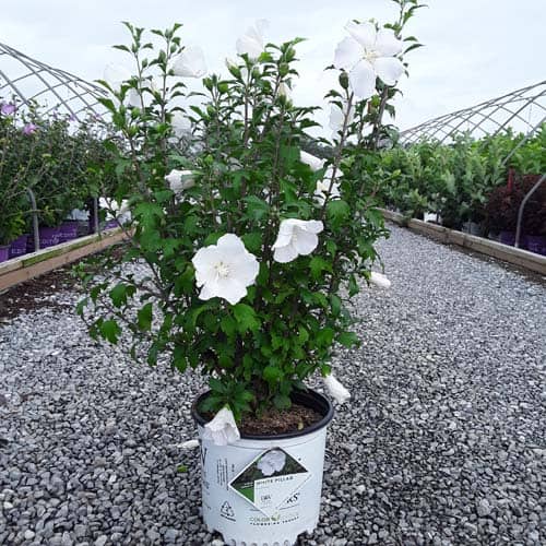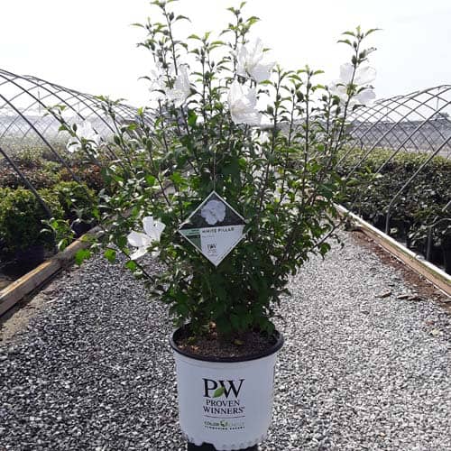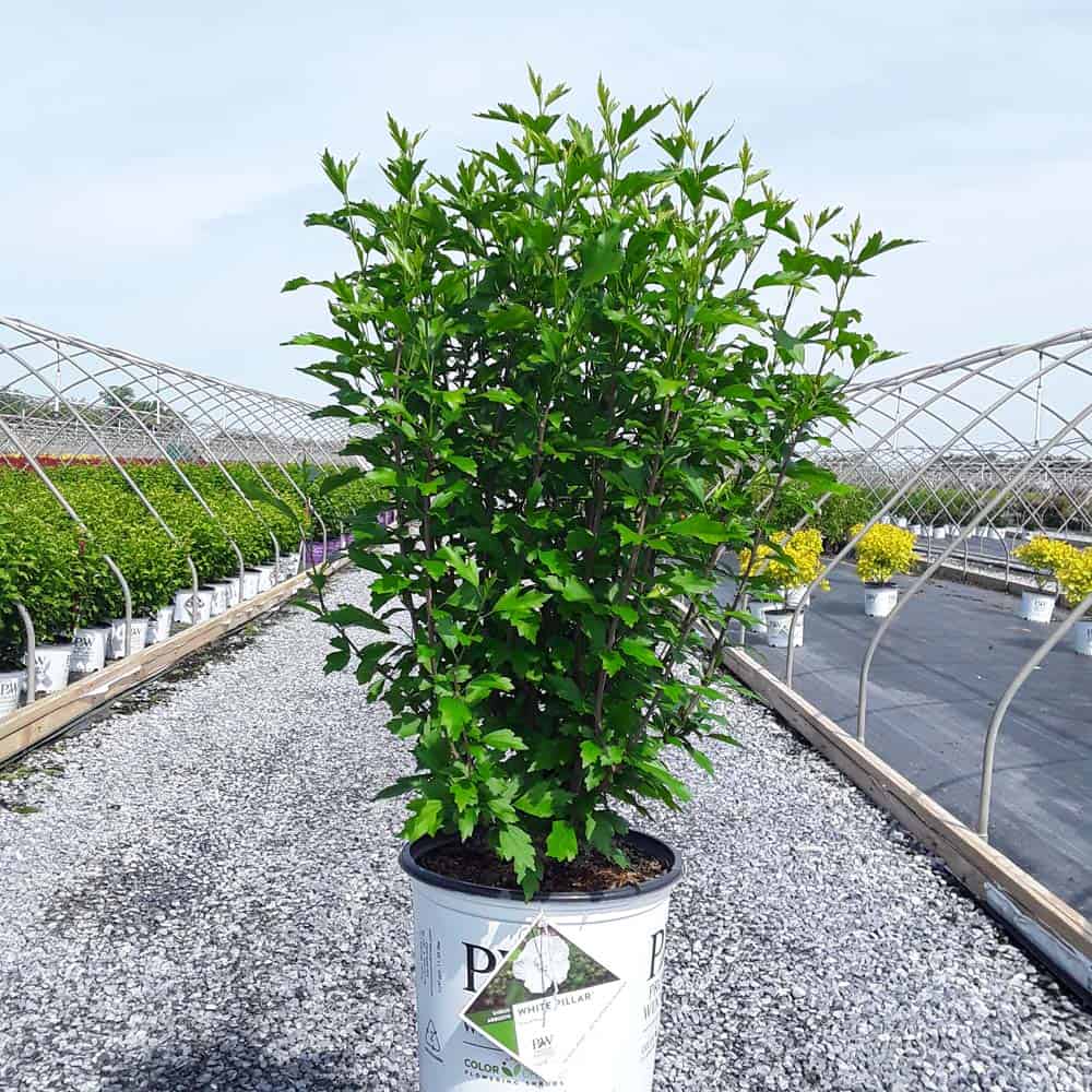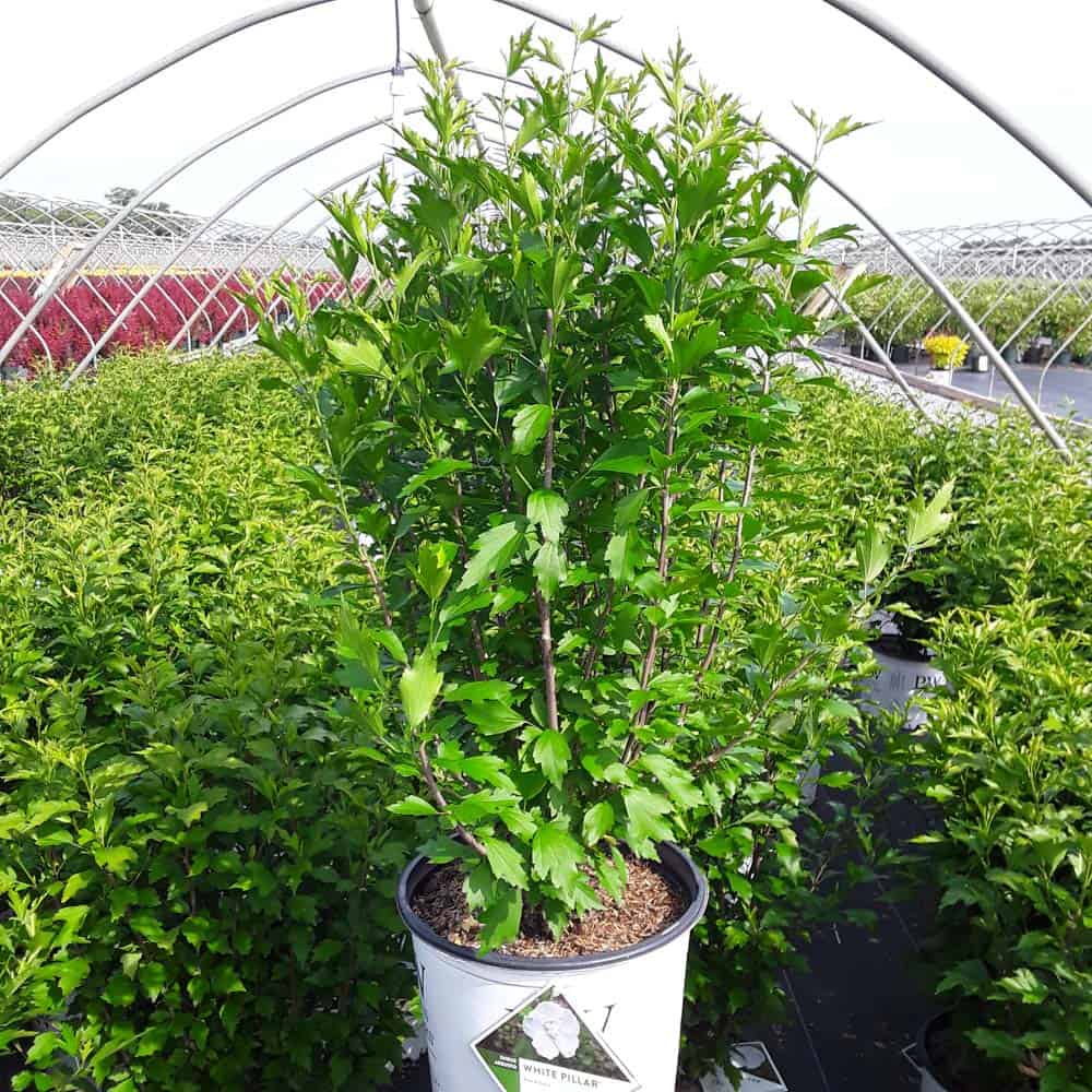 "White Pillar® rose of Sharon is a sister plant to Purple Pillar®, the plant that changed how you think about rose of Sharon. Both naturally grow as a narrow column, so it takes up just a fraction of the space that conventional roses of Sharon do. This particular variety sports pure white, semi-double blooms, making it an elegant choice for planting in any style landscape and along with any type of architecture. This unusual, space-saving habit unlocks so many new design possibilities: plant alongside your front entrance, as the centerpiece to a formal container, as a privacy screen, or a dramatic specimen. It's easier than ever to enjoy this summer-blooming favorite." Spring Meadow Nursery [Hibiscus]