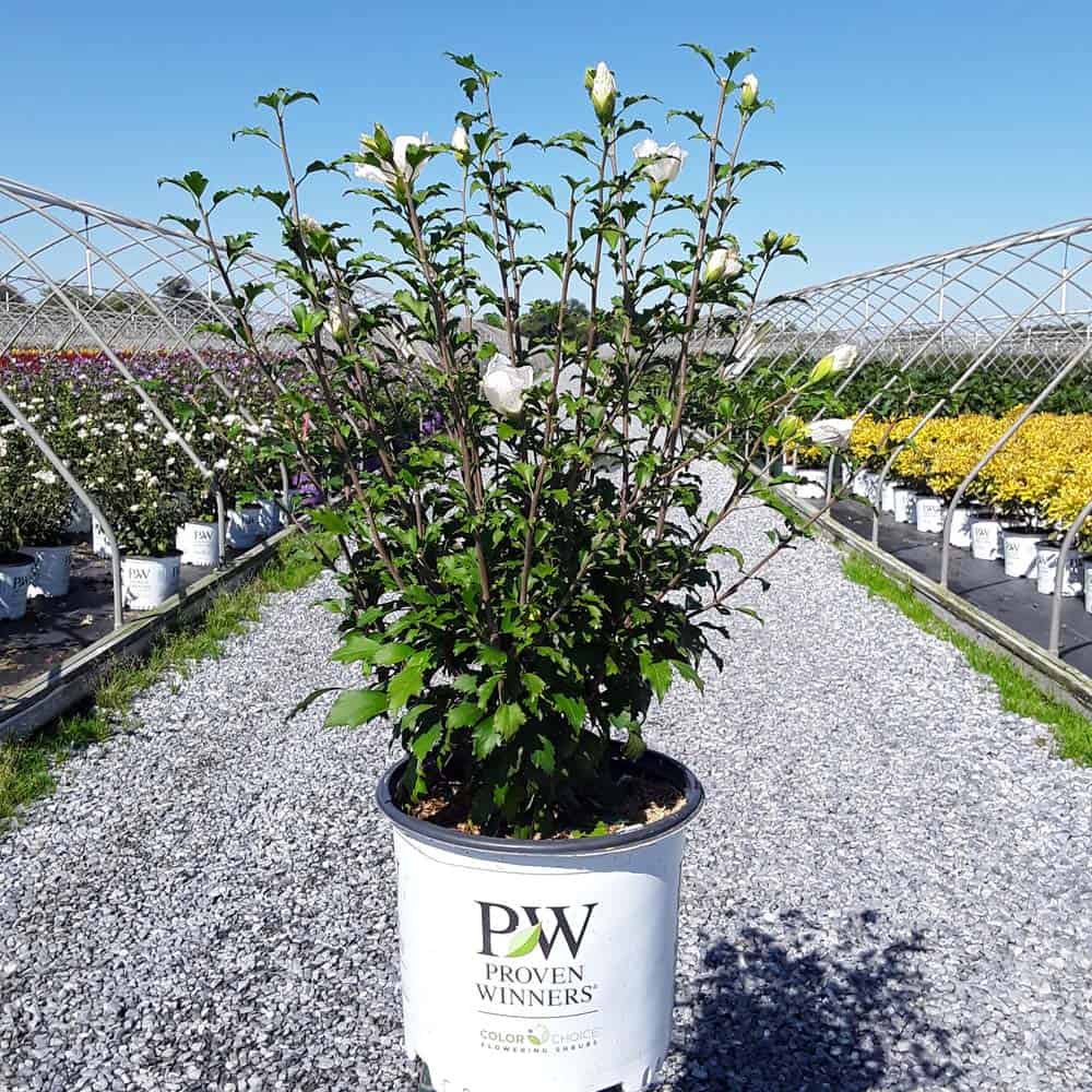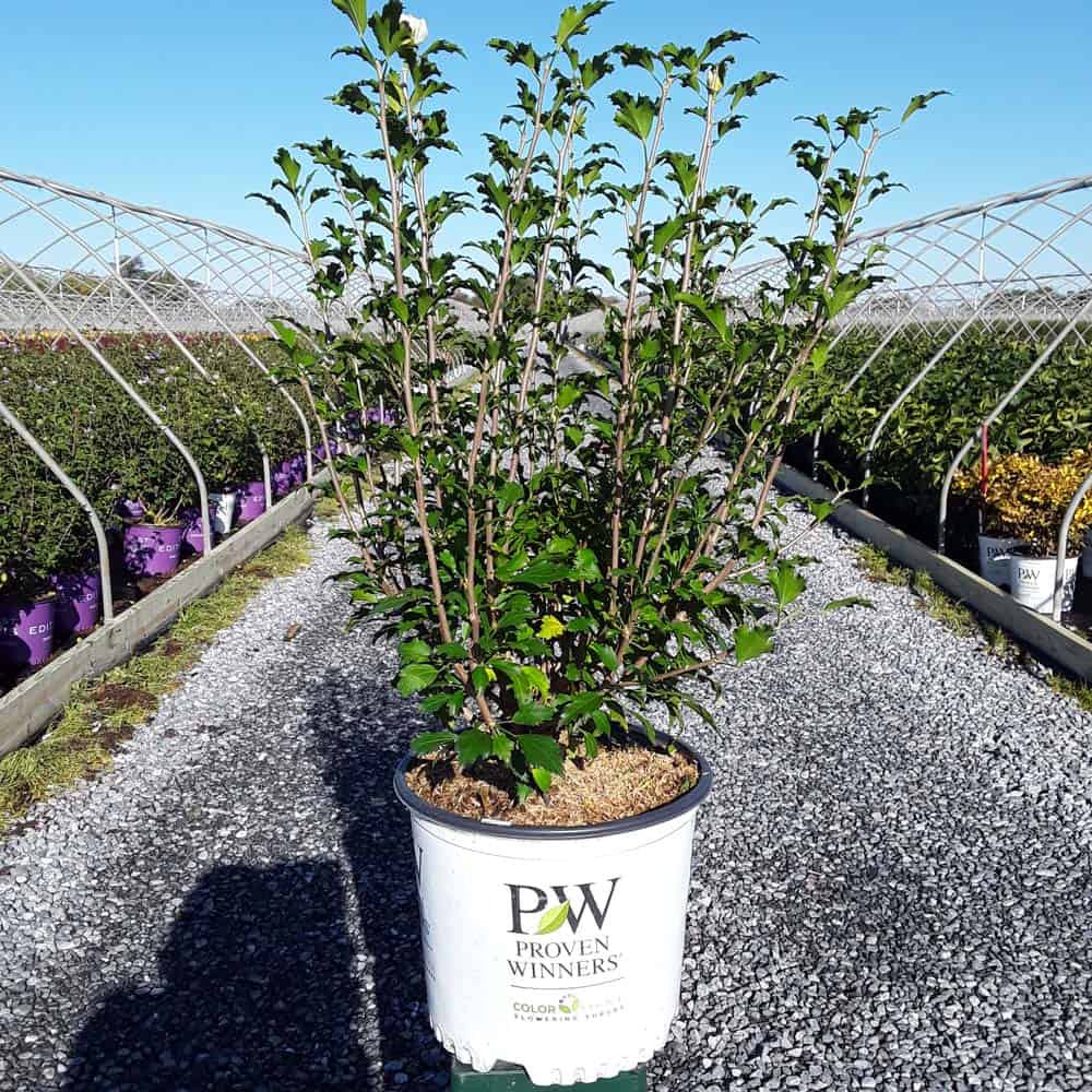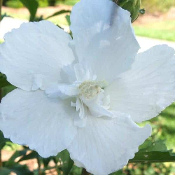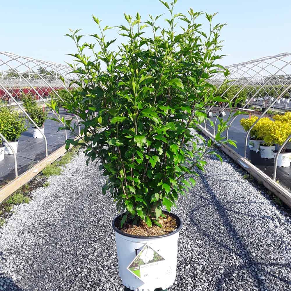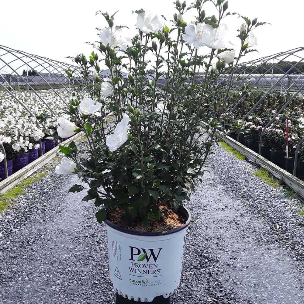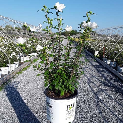 "White Pillar® rose of Sharon is a sister plant to Purple Pillar®, the plant that changed how you think about rose of Sharon. Both naturally grow as a narrow column, so it takes up just a fraction of the space that conventional roses of Sharon do. This particular variety sports pure white, semi-double blooms, making it an elegant choice for planting in any style landscape and along with any type of architecture. This unusual, space-saving habit unlocks so many new design possibilities: plant alongside your front entrance, as the centerpiece to a formal container, as a privacy screen, or a dramatic specimen. It's easier than ever to enjoy this summer-blooming favorite." Spring Meadow Nursery [Hibiscus]