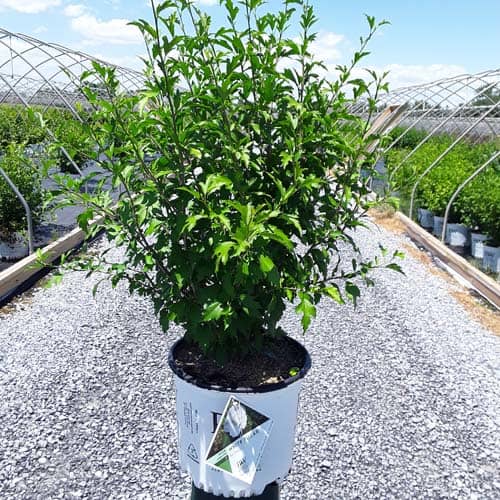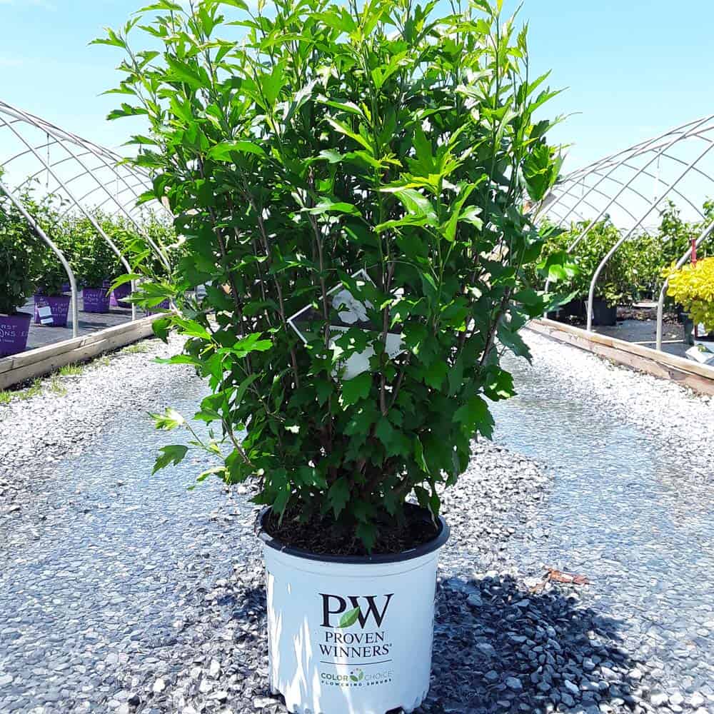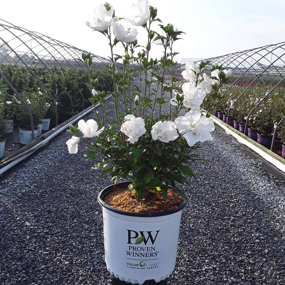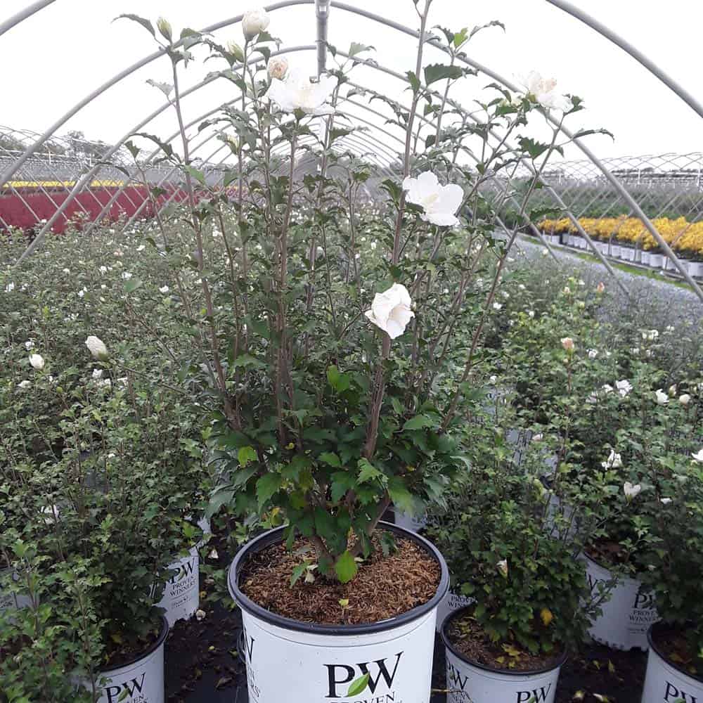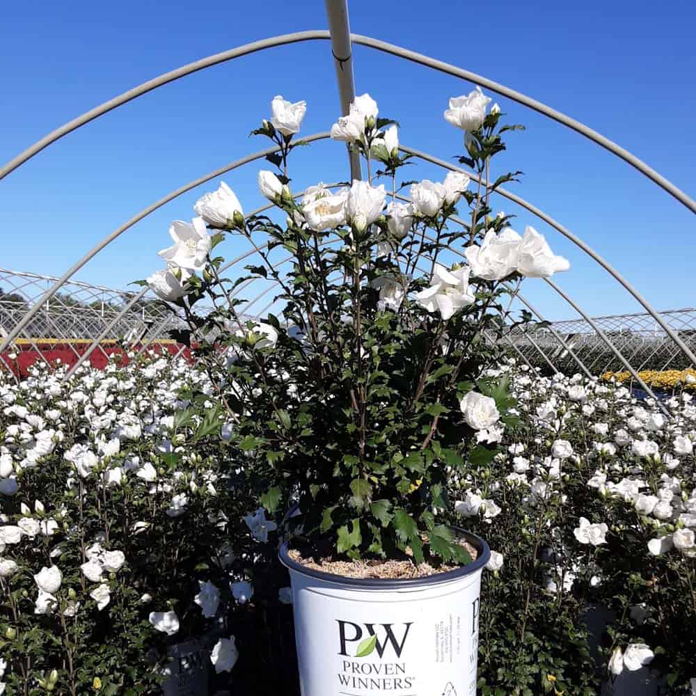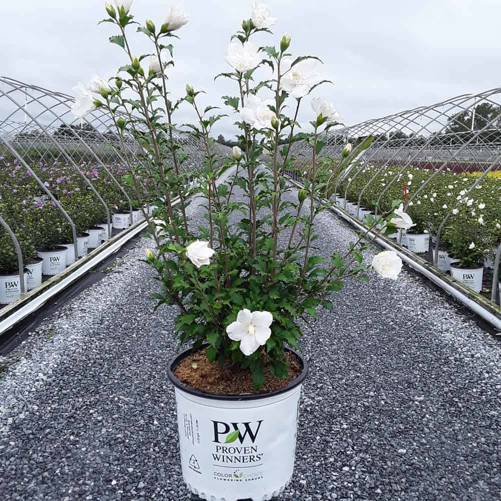 "White Pillar® rose of Sharon is a sister plant to Purple Pillar®, the plant that changed how you think about rose of Sharon. Both naturally grow as a narrow column, so it takes up just a fraction of the space that conventional roses of Sharon do. This particular variety sports pure white, semi-double blooms, making it an elegant choice for planting in any style landscape and along with any type of architecture. This unusual, space-saving habit unlocks so many new design possibilities: plant alongside your front entrance, as the centerpiece to a formal container, as a privacy screen, or a dramatic specimen. It's easier than ever to enjoy this summer-blooming favorite." Spring Meadow Nursery [Hibiscus]