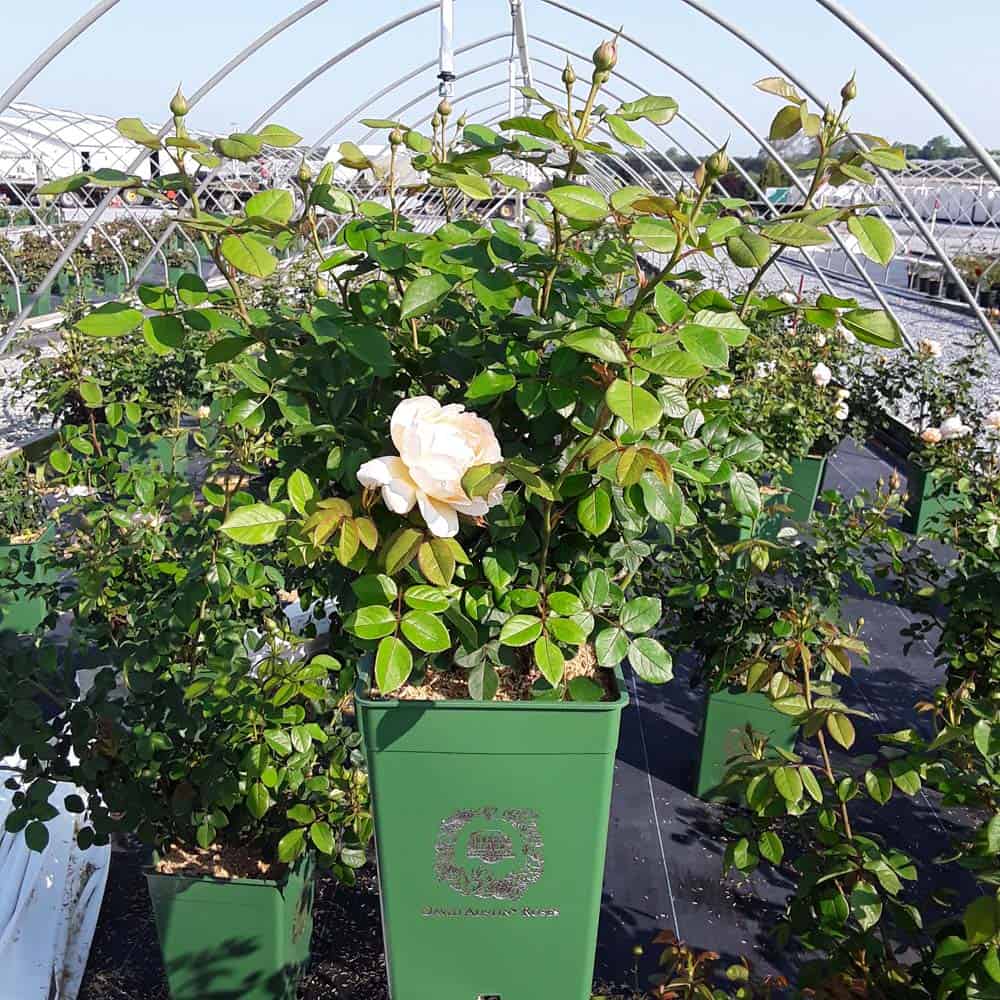"A wonderfully fragrant climber – its strong, warm myrrh fragrance has intense hints of citrus. The buds have attractive flashes of red, open to beautifully rounded, chalice-shaped blooms of pale apricot, eventually paling to cream." - David Austin® Roses